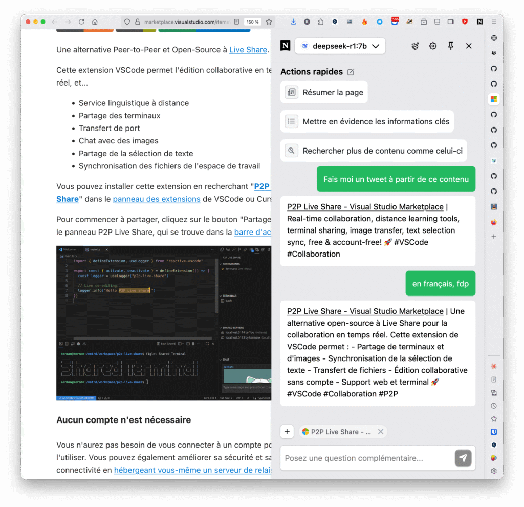 Voilà, donc si vous voulez utiliser un peu d’IA pour comprendre des trucs sur des pages web, reformuler des mails que vous envoyez, générer des tweets à partir d’un contenu…etc, Nativemind est fait pour vous ! C’est largement suffisant pour des besoins d’IA classiques.