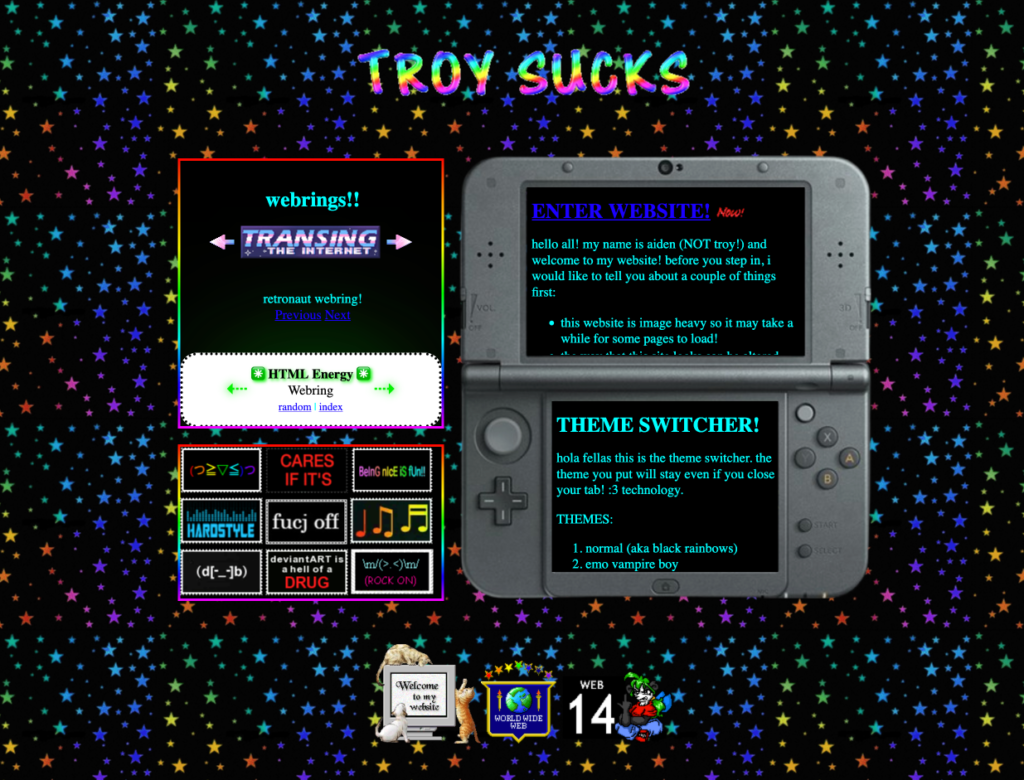c’est également l’aspect social. On retrouve les fameux “WebRings” comme à l’époque… Si vous n’avez pas connu, bande de bébés, c’était des sites qui se liaient les uns aux autres pour former des anneaux thématiques. C’était vraiment chouette. On retrouve aussi sur NeoCities un système de tags pour découvrir des trucs cool, comme à l’ancienne, bien loin des algo de réseaux sociaux qui vous enferment dans une bulle.