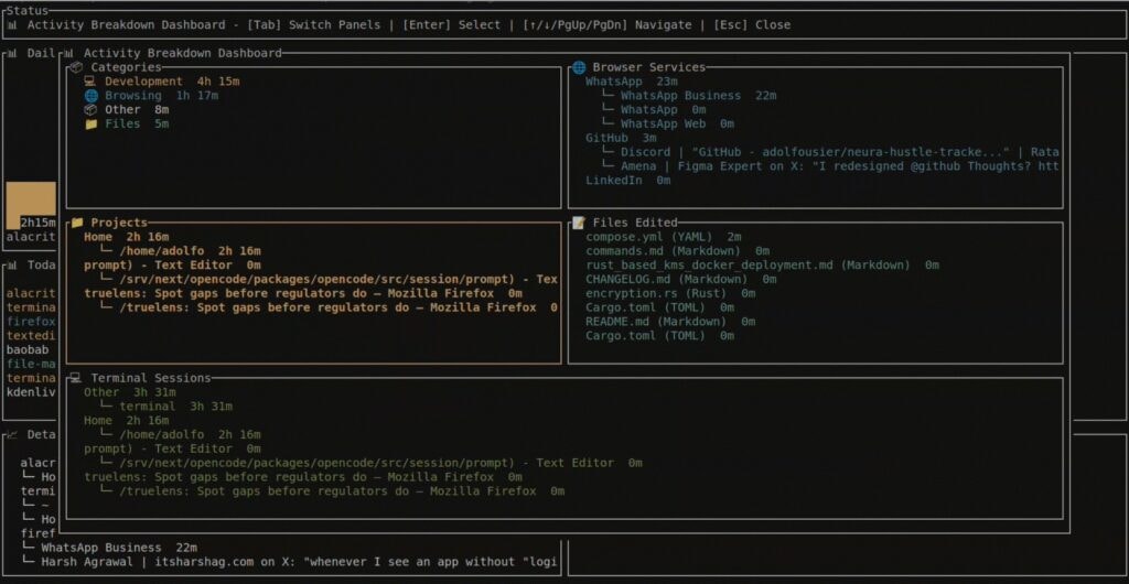 qui est un tracker de temps open-source, écrit en Rust, qui tourne dans votre terminal et stocke TOUT en local sur votre machine dans un PostgreSQL. Comme ça, aucune donnée ne quitte votre ordinateur.