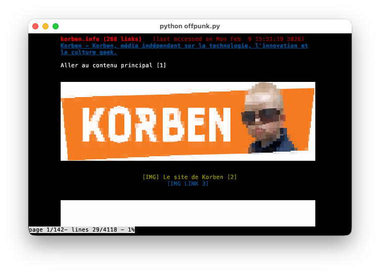 embarquent des moteurs complets pour le web moderne. Offpunk mise en fait sur l’extraction de contenu, du coup, vous synchronisez vos pages quand vous avez du réseau, et vous les lisez plus tard, sans distractions ni scripts qui ralentissent tout.
