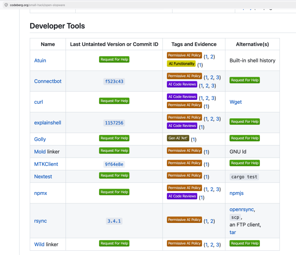 , c’est hébergé sur Codeberg, et ça recense tous les projets open source qui ont eu le “malheur” de laisser l’IA s’approcher de leur code.