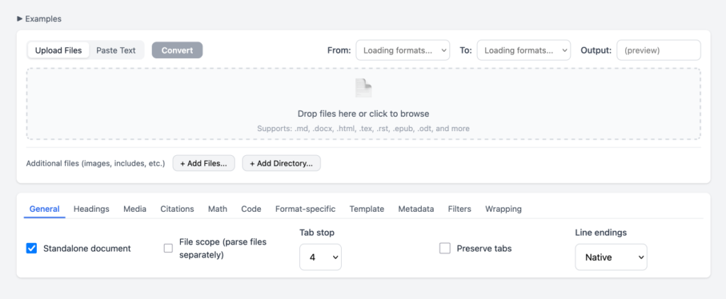 . L’interface est basique, vous glissez-déposez votre .docx ou .tex, vous choisissez le format de sortie dans le menu déroulant, et vous cliquez sur Convert. Et c’est terminé.