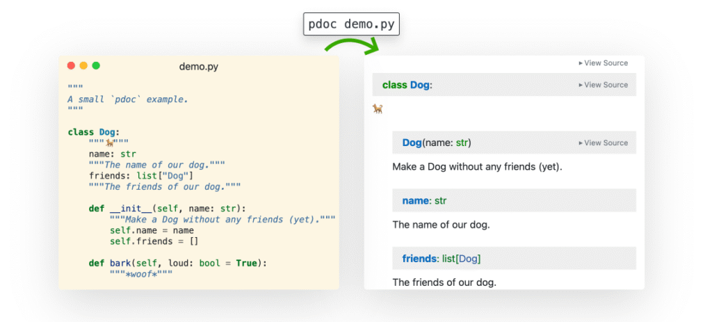 Si vous avez déjà écrit des docstrings propres et utilisé les type annotations de Python, vous avez déjà fait 100% du boulot car pdoc se contente de prendre ce qui existe et de l’afficher élégamment. Pas de traduction, pas de réécriture, pas de fichiers .rst à maintenir en parallèle de votre code.