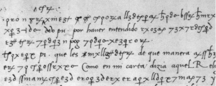 Pour empêcher les rivaux de la lire si jamais elle se faisait intercepter en chemin, Ayala a alors chiffré une partie du texte avec un système de symboles maison où, vice ultime du gars, plusieurs symboles différents pouvaient représenter la même lettre.