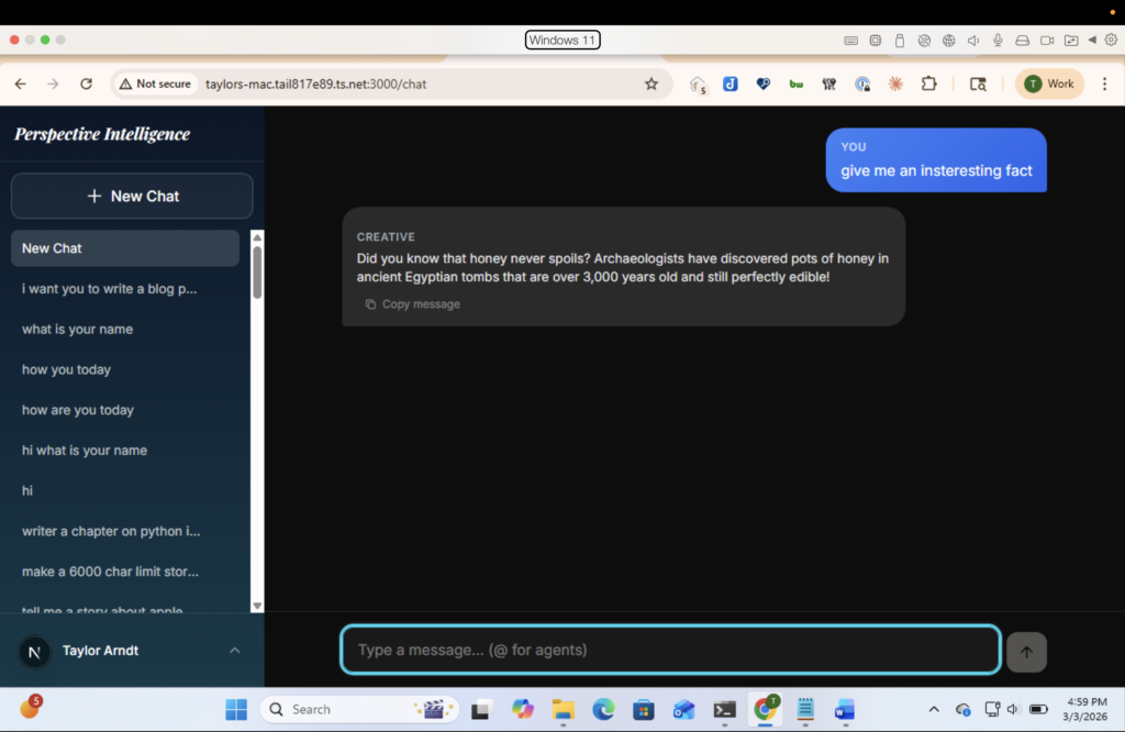 Le client web, c’est du Next.js 16 avec un look à la iMessage, thème sombre, bulles de chat, streaming en temps réel via SSE. Vous vous connectez depuis Chrome sur Windows, Firefox sur Linux, Safari sur iPad… peu importe. Tant que ça affiche une page web, c’est que ça marche !