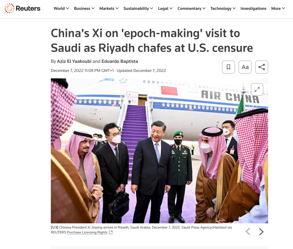 7 décembre 2022, Riyadh. L’avion du président Xi Jinping est escorté par quatre chasseurs de l’armée saoudienne qui dessinent les couleurs chinoises dans le ciel. Le prince Faisal bin Bandar Al Saud l’accueille sur le tarmac pour le premier sommet historique Chine-États arabes. Signature de la Déclaration de Riyadh, renforcement du partenariat stratégique entre Pékin et Riyad. Ça ne rigole pas !