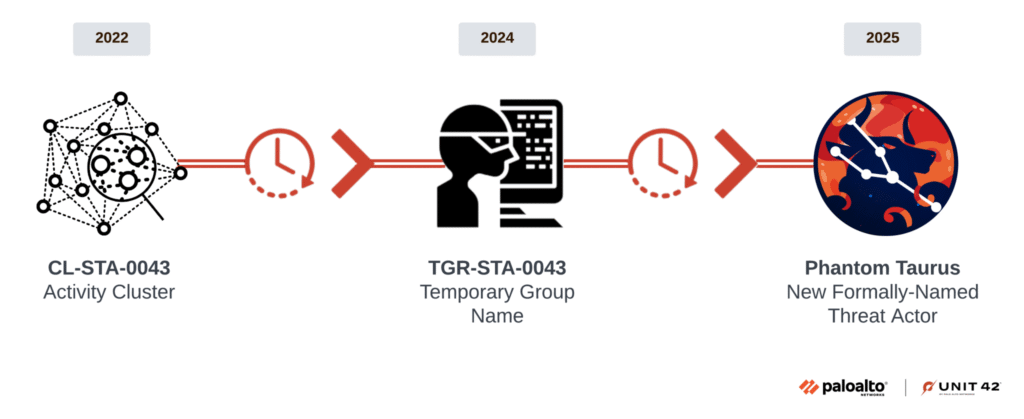 L’histoire commence réellement en juin 2023 quand les analystes de Unit 42 détectent des activités suspectes qu’ils classent sous le code CL-STA-0043. Un cluster d’activité malveillante parmi des centaines d’autres, sauf que celui-là sent plutôt “bon”. Pendant des mois, les chercheurs accumulent les preuves, connectent les points, observent les patterns.