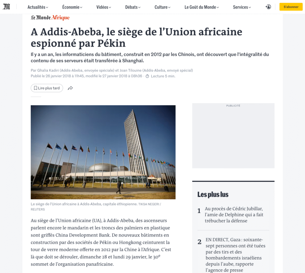 Durant cinq ans, chaque nuit entre minuit et 2h du matin, toutes les données du siège de l’UA étaient transférées vers des serveurs à Shanghai. Quand l’UA a voulu acheter ses propres serveurs, la Chine a “généreusement” offert de les fournir gratuitement. Du coup, ils se sont retrouvés avec des serveurs pré-compromis installés au cœur même de l’organisation panafricaine.