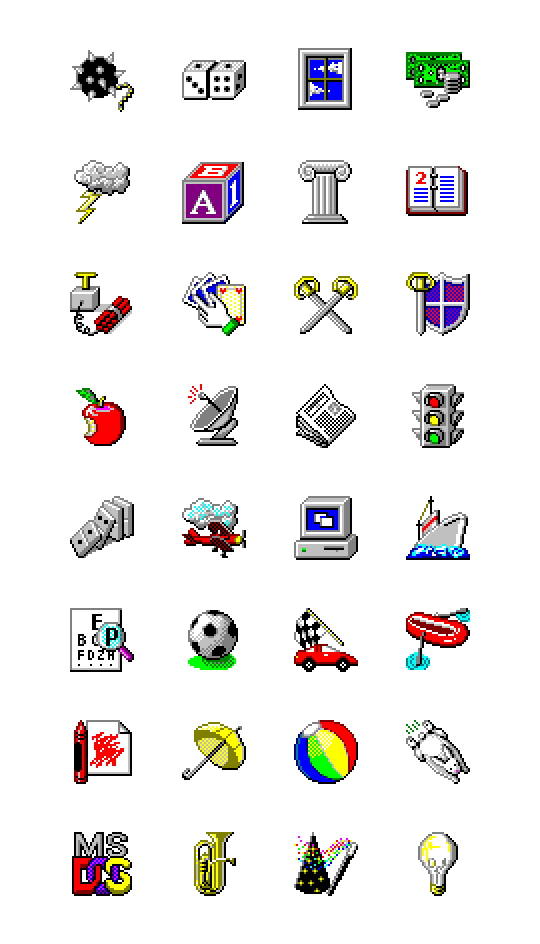 Mais Raymond Chen, ce coquin, a décidé de planquer dedans une petite collection d’icônes 16 couleurs totalement inutiles. Des fenêtres, des balles, des trompettes, des chapeaux de magicien, des blocs de jeu avec des lettres, des nuages. Je suis sûr que ça va vous rappeler des souvenirs !! C’est le genre de trucs qu’on mettait sur nos raccourcis foireux quand on voulait customiser notre bureau Windows avec des icônes qui claquaient ^^.