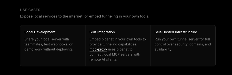 Il fait ça particulièrement bien en utilisant une architecture client et serveur. Vous pouvez donc utiliser leur serveur public par défaut (pipenet.dev) ou carrément héberger votre propre infrastructure de tunneling ! C’est top pour la confidentialité si vous pouvez l’auto-héberger !