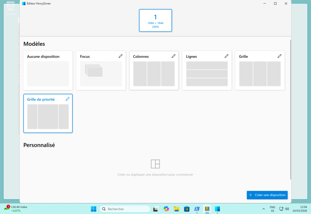 Le premier truc qui change la vie, c’est FancyZones. Si vous avez un grand écran, le Snap Layout de Windows 11 c’est… limité. Avec FancyZones, vous créez vos propres zones de dépôt. Vous maintenez MAJ, vous glissez une fenêtre, hop, elle se cale exactement où vous voulez. Une fois qu’on y a goûté, impossible de revenir en arrière.