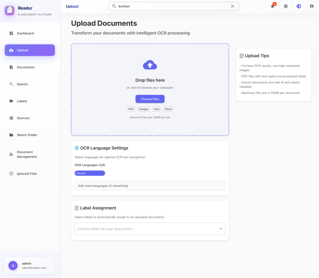 Comme ça, vous balancez vos fichiers (PDF, images, fichiers texte, documents Office…) via un petit drag-and-drop des familles et Readur fait le reste !