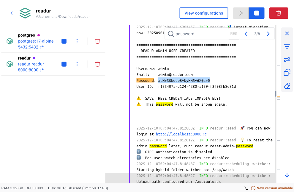 Et hop, l’interface est accessible sur localhost:8000. Pour le mot de passe, dans la doc, il est écrit que c’est admin / readur2024 mais c’est faux. Le mot de passe est généré en random au lancement du conteneur Docker. Faut juste regarder dans les logs de Docker et vous pourrez le changer après coup.