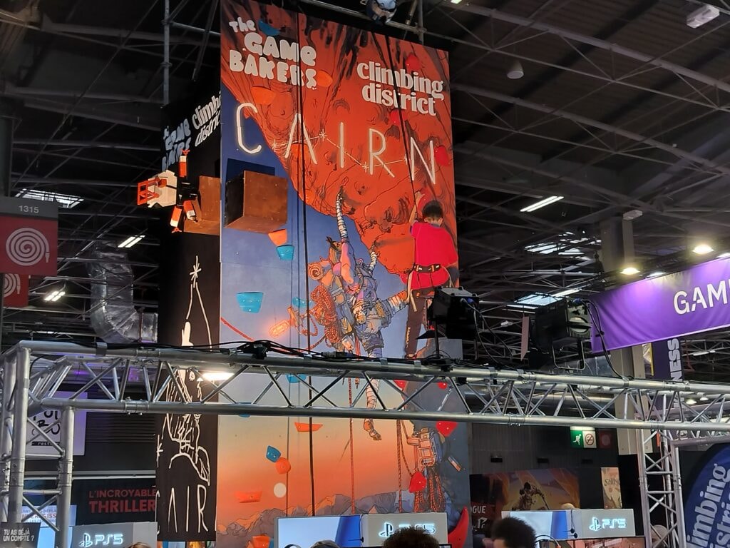 Cairn aussi proposait une expérience immersive. C’est un jeu d’escalade développé par les Montpelliérains de The Game Bakers et ils avaient installé un vrai mur d’escalade dans le salon, c’était assez incroyable de voir ça au milieu des stands. Le jeu sort début 2026 sur PC et PS5, et c’est pas de la VR comme on pourrait croire, mais juste une simulation ultra réaliste où vous devez gérer l’endurance de la grimpeuse Aava qui tente de gravir le Mont Kami. Les graphismes sont signés Mathieu Bablet, l’auteur de BD, et ça claque.
