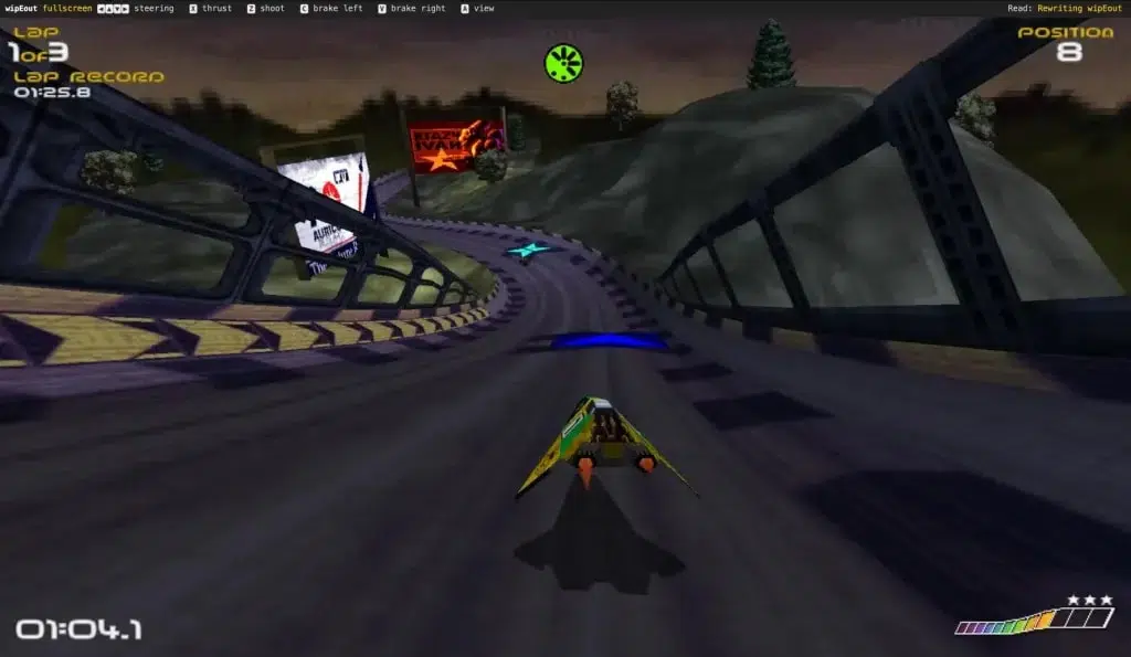 La bonne nouvelle, c’est qu’il existe plusieurs réimplémentations de ce jeu génial. La première, nommée wipEout Rewrite, a été créée grâce au code source d’origine divulgué en 2022. Le développeur a réussi à adapter le jeu pour qu’il fonctionne sur les plateformes SDL2 et Sokol, avec une prise en charge des contrôleurs de jeu.