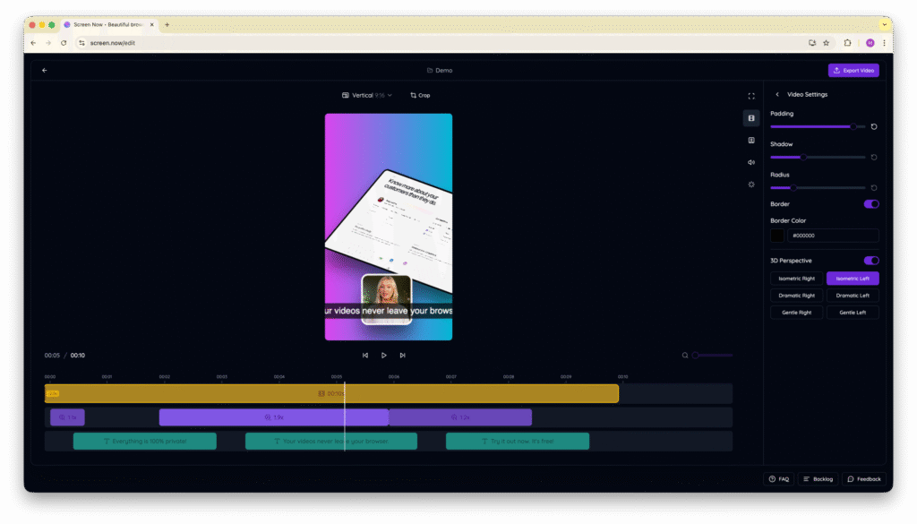 La liste des fonctionnalités fait un peu peur parce qu’il y a beaucoup de choses mais vous allez voir c’est très cool. Y’a par exemple la possibilité de mettre votre vidéo d’écran en vue 3D avec perspective, rotation et contrôle d’angle, exactement comme avec les outils pros.