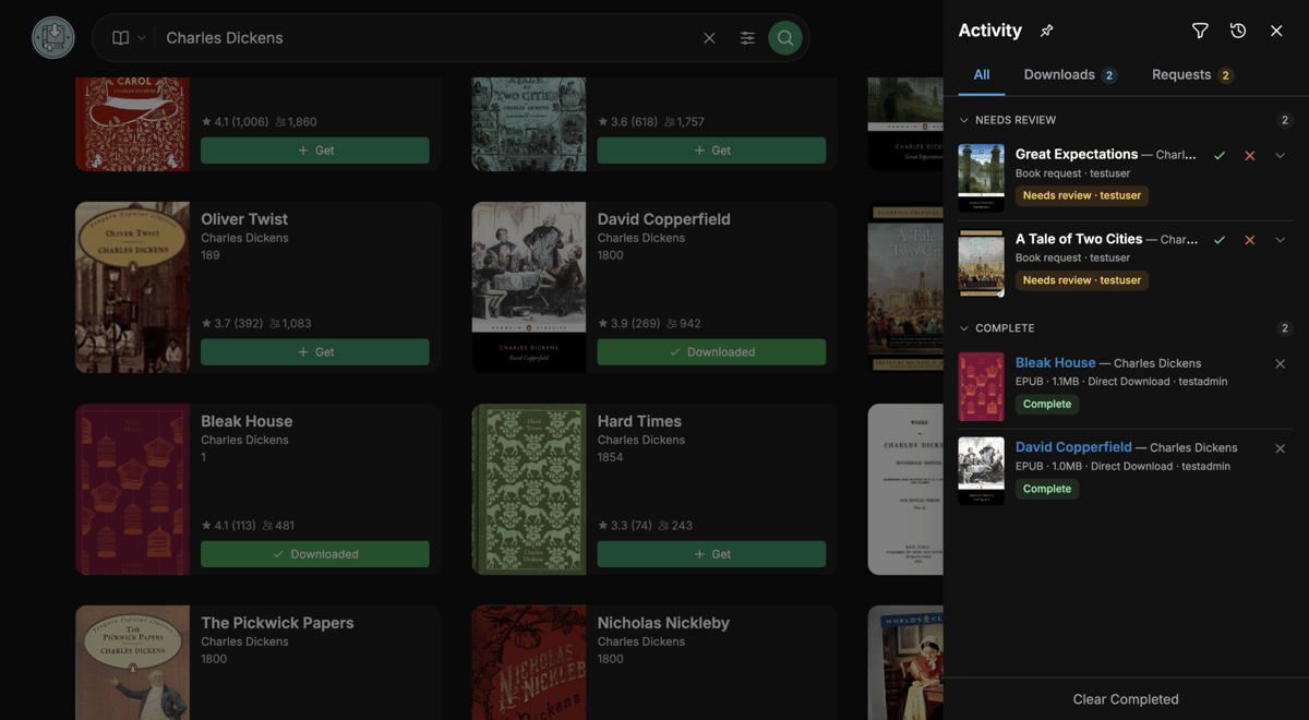 Comme ça, vous tapez le titre, ça interroge Hardcover, Open Library ou Google Books pour les métadonnées, ça agrège les résultats des sources, et vous cliquez sur le format qui vous arrange. Si le dossier de destination pointe vers l’ingest folder de Calibre-Web-Automated, Grimmory ou Audiobookshelf, l’import est alors automatique ce qui fait que vous n’avez aucun script maison à entretenir.