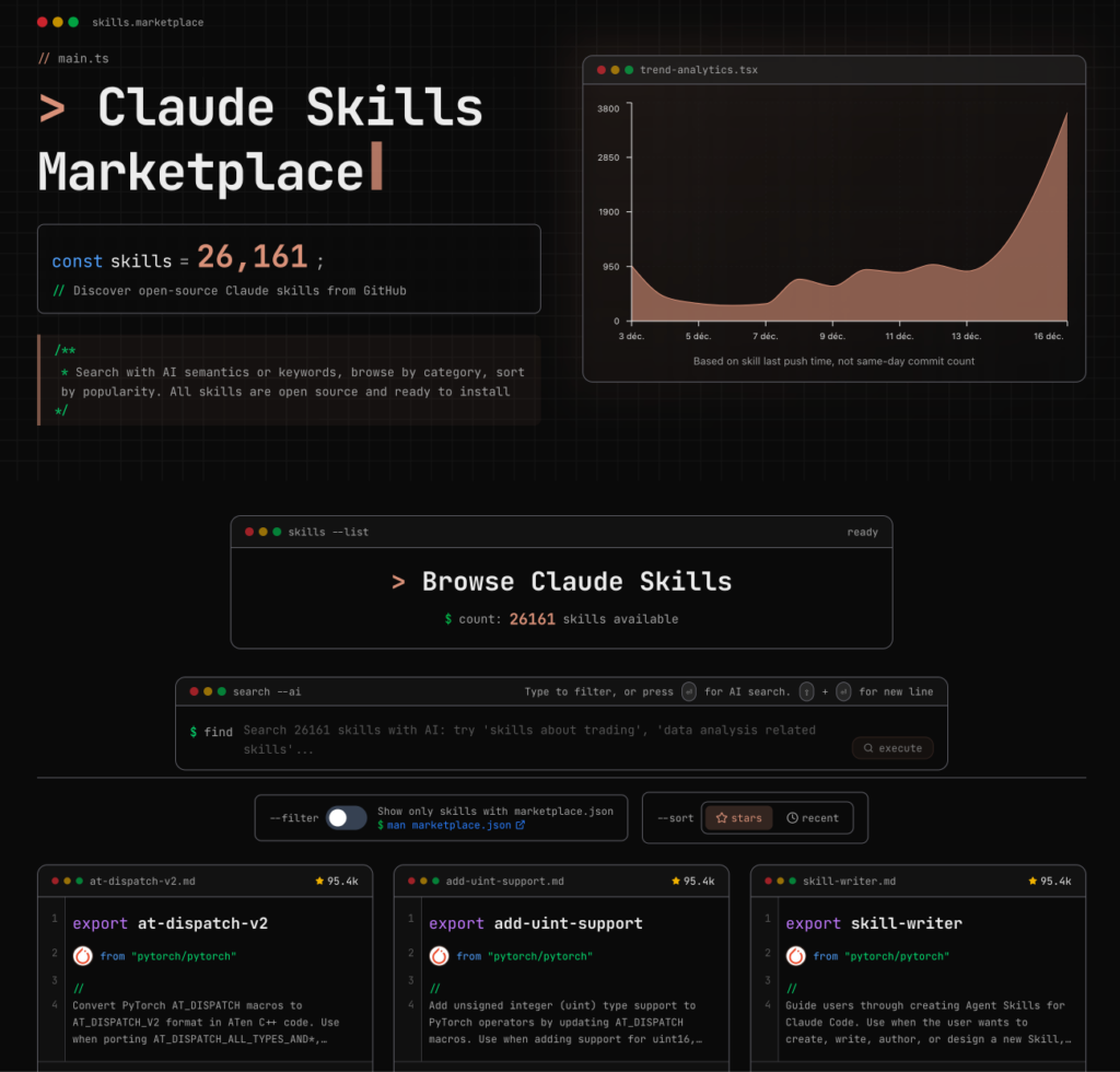 qui vient résoudre ce problème. C’est en fait un marketplace communautaire (pas affilié à Anthropic) qui agrège plus de 26 000 skills Claude provenant de dépôts GitHub publics, le tout présenté dans une interface qui ressemble à un App Store, avec des catégories, des stats, et tout le toutim.