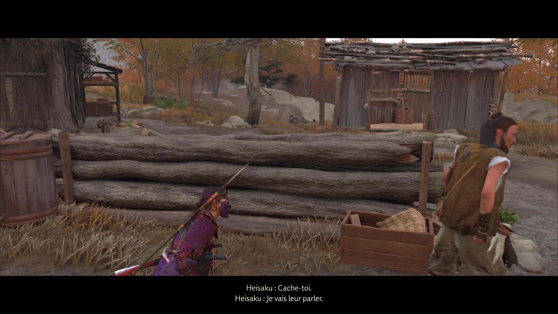 Hélas, des hommes de Saito débarquent. Le fermier vous demande de rester caché tandis qu’il va leur parler. Faites le tour de la maison par la gauche sans être vu et montez sur le toit.