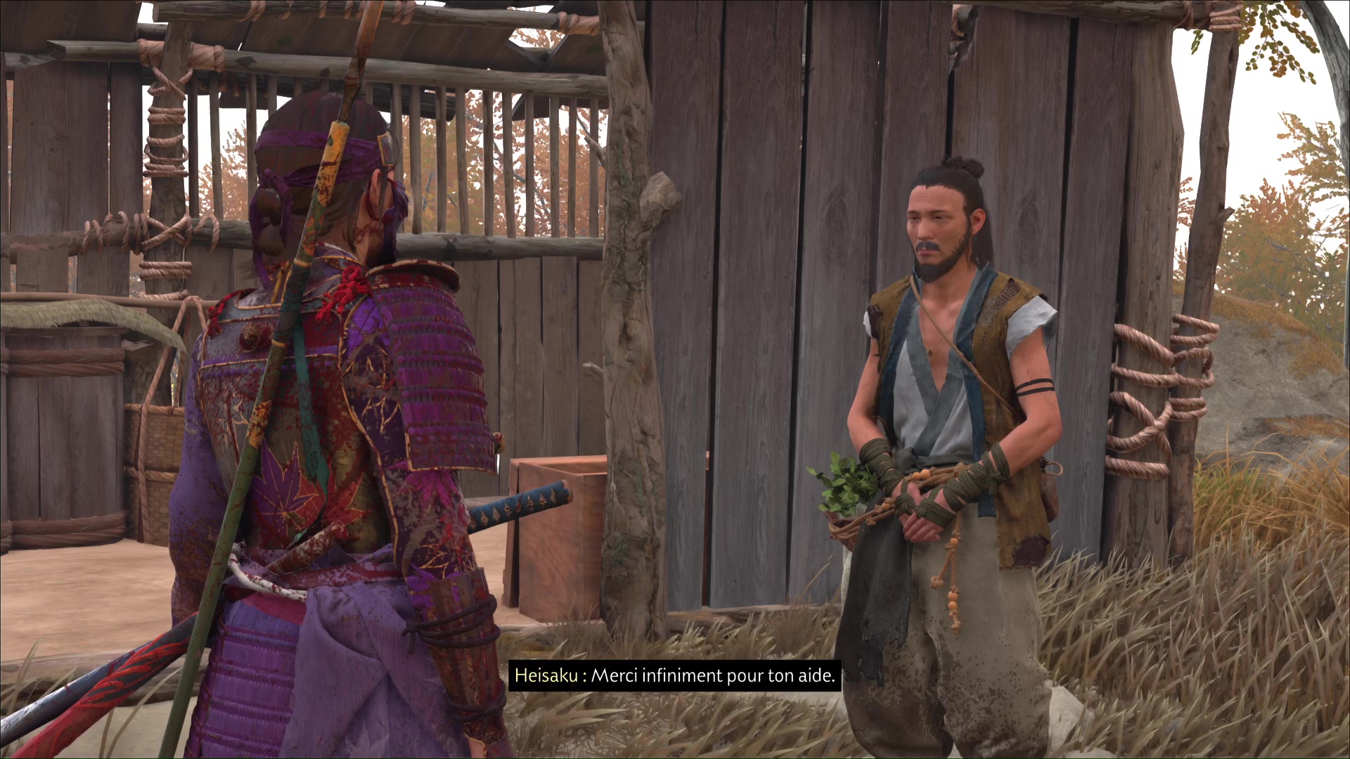Ce n’est pas tout, le fermier a un travail pour vous. Du bambou a poussé dans son potager, et il a besoin d’une lame affûtée pour le découper. Acceptez la mission et suivez le fermier. Il y a trois groupes de bambous à découper. Réglez donc ceci rapidement et Heisaku vous emmènera à votre récompense.