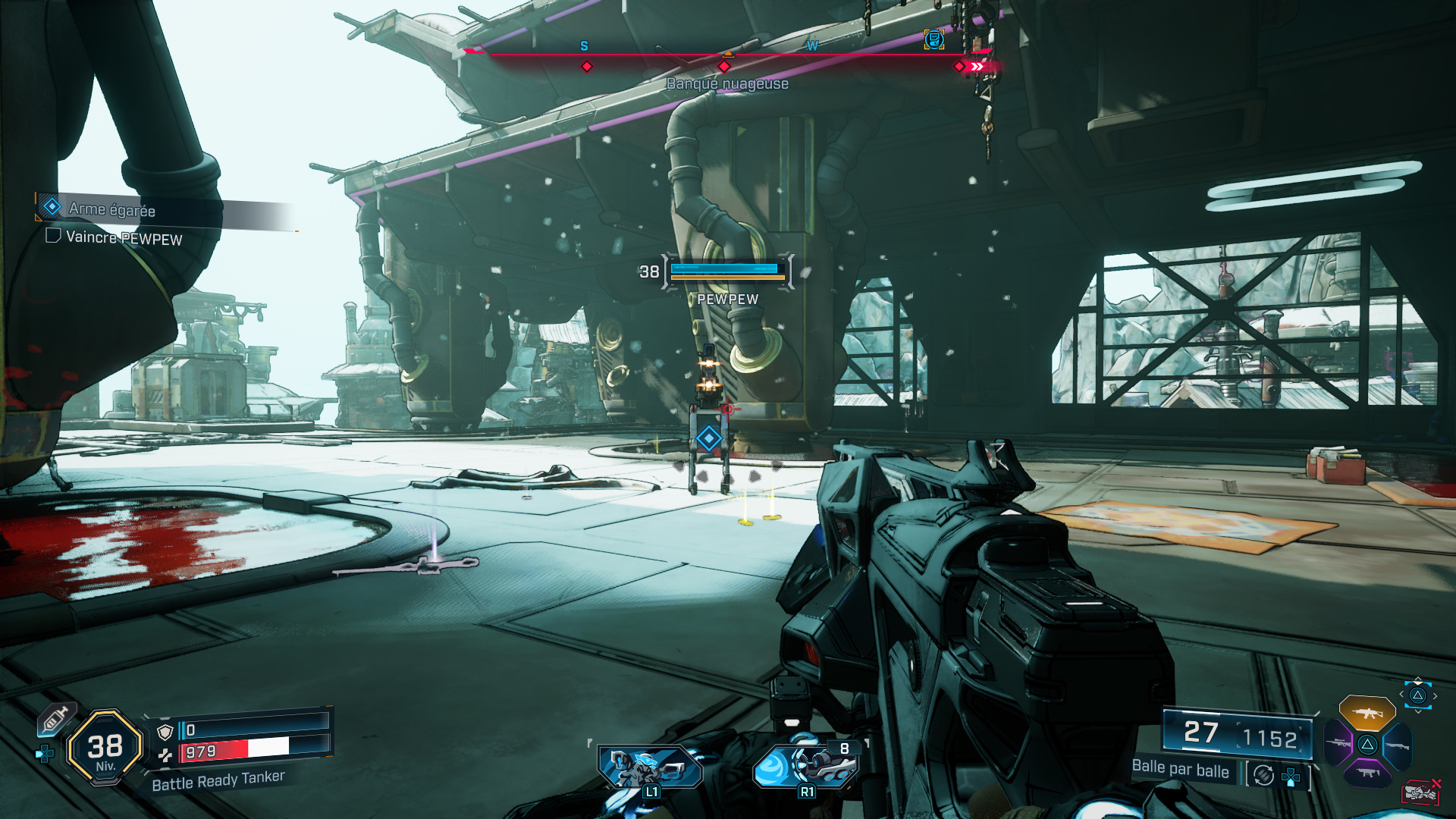 Avancez pour affronter PEWPEW, le seul moyen de le vaincre étant de tirer dessus pour l’immobiliser et ensuite l’achever au corps-à-corps. Pour finir, approchez-vous de l’ordinateur au fond de la pièce et piratez-le pour réinitialiser le noyau de PEWPEW et mettre un terme à cette mission.