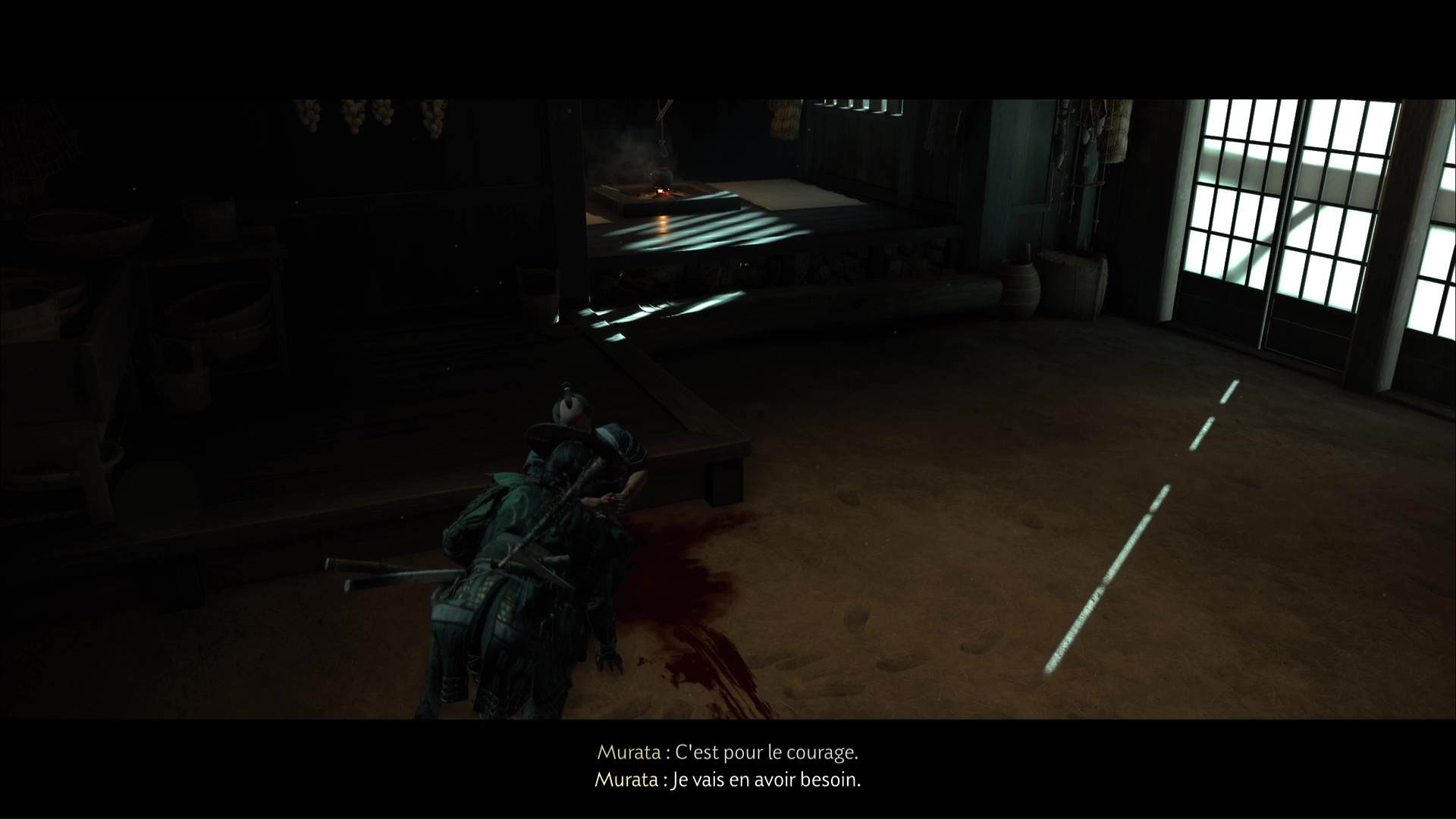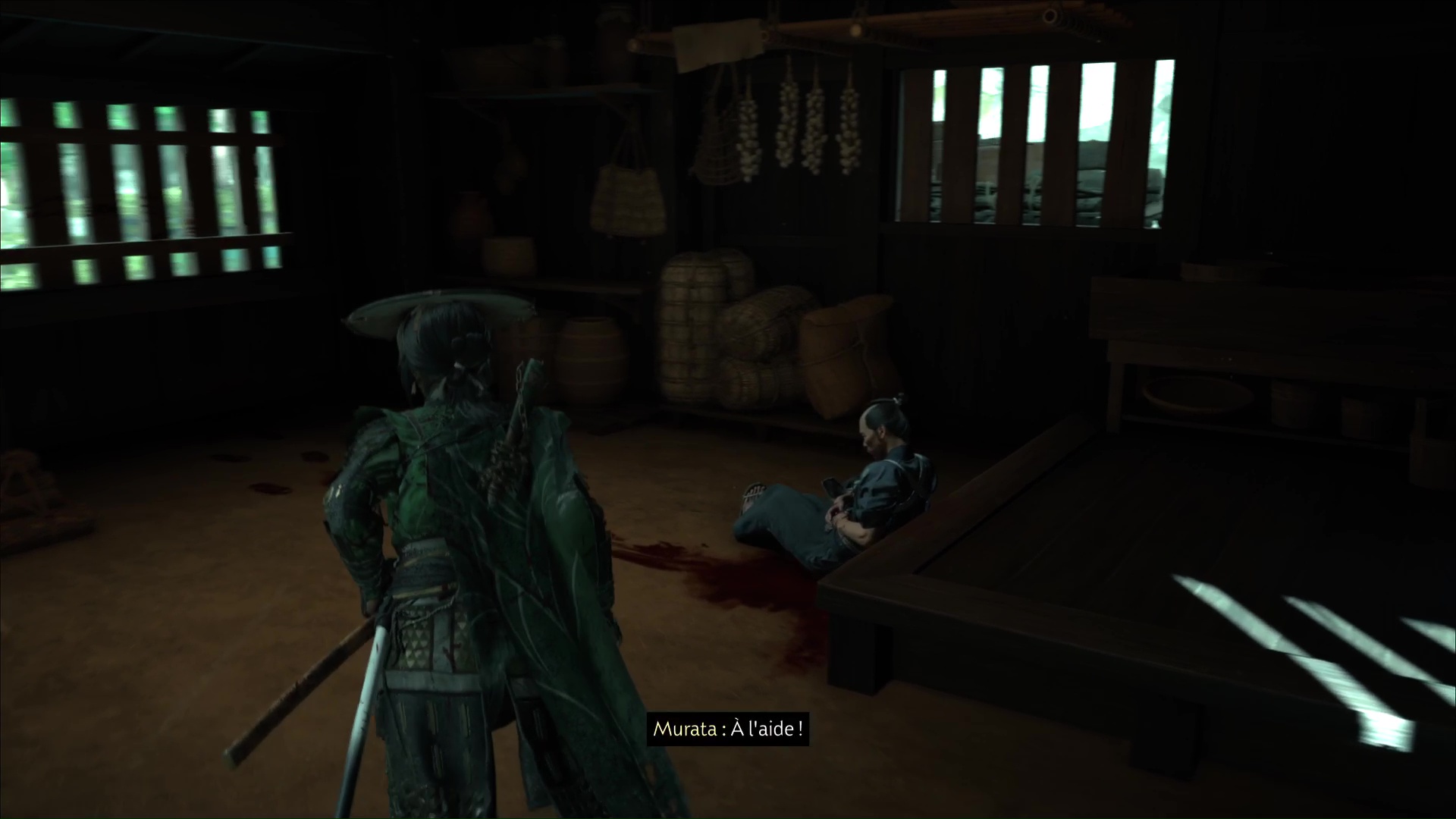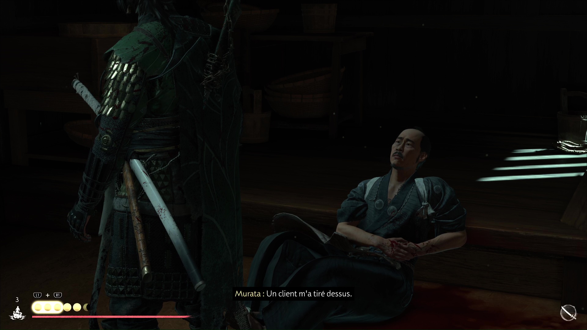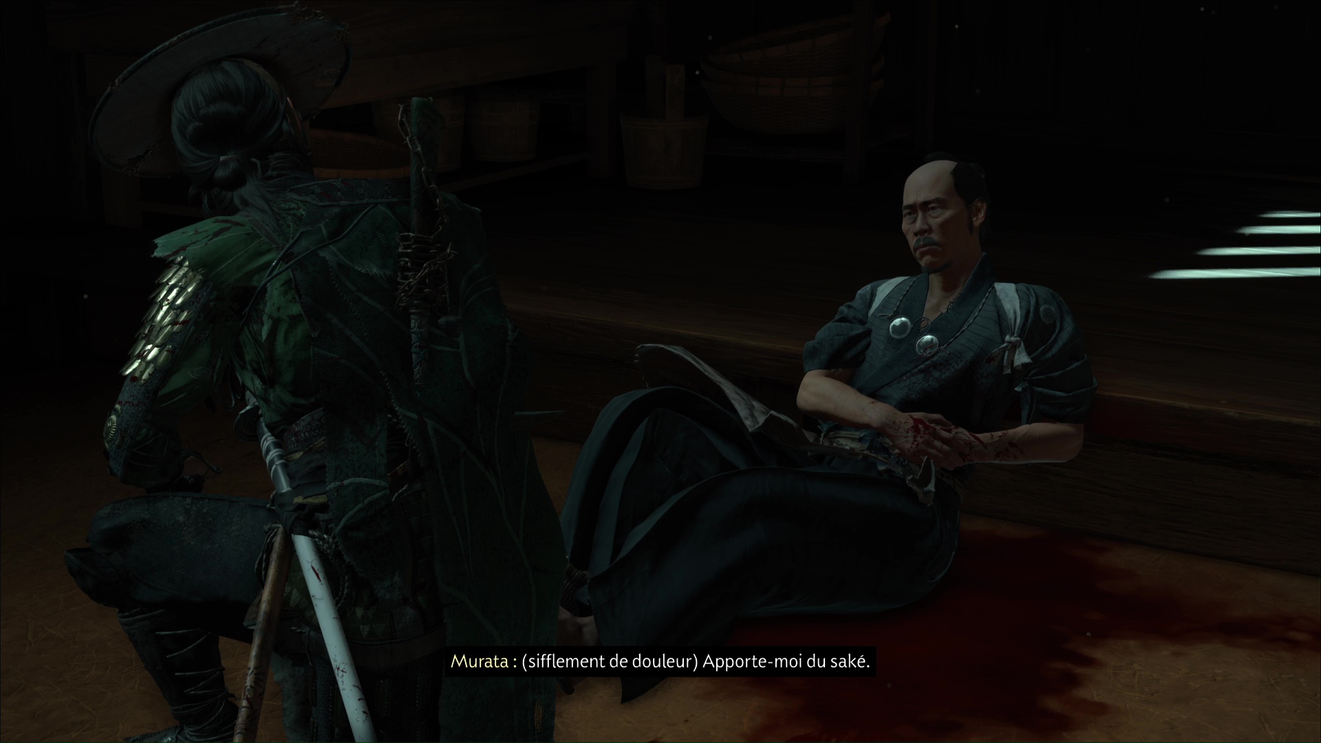 Approchez de la maison et ouvrez la porte. À l’intérieur, vous constaterez que Murata est mal en point. Parlez-lui pour apprendre qu’un de ses clients lui a tiré dessus. Il vous dira ensuite d’aller lui chercher du saké.
