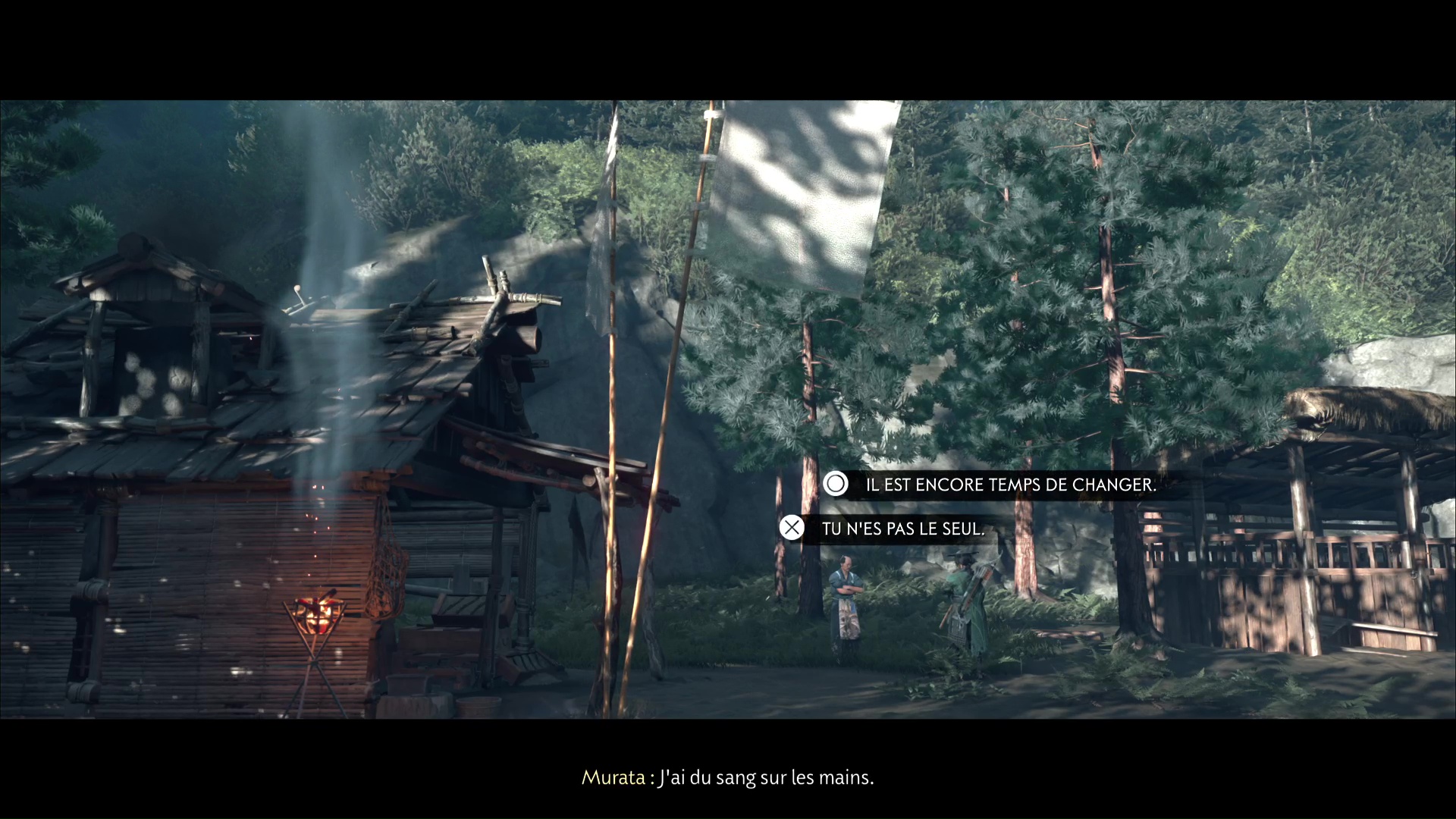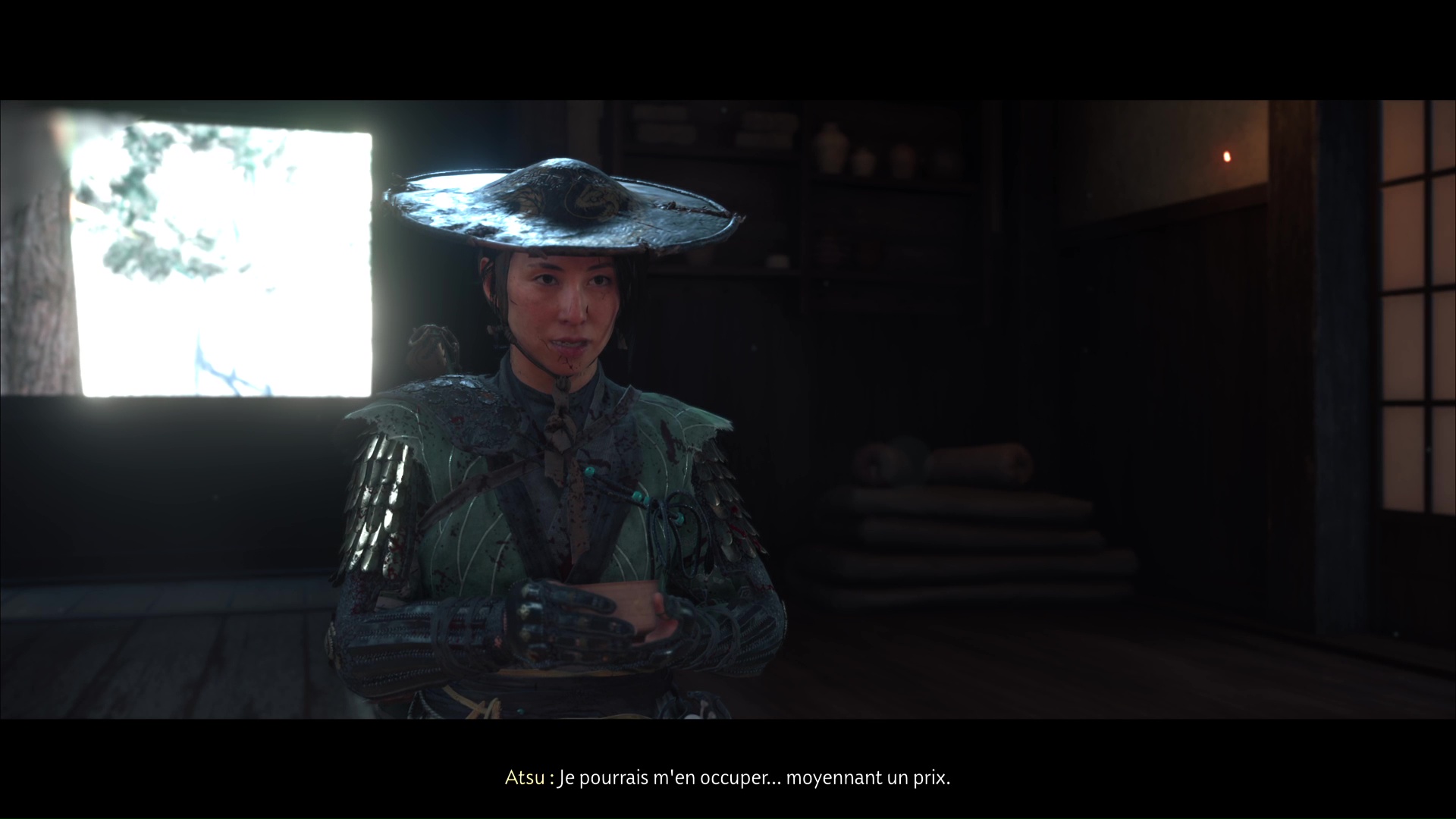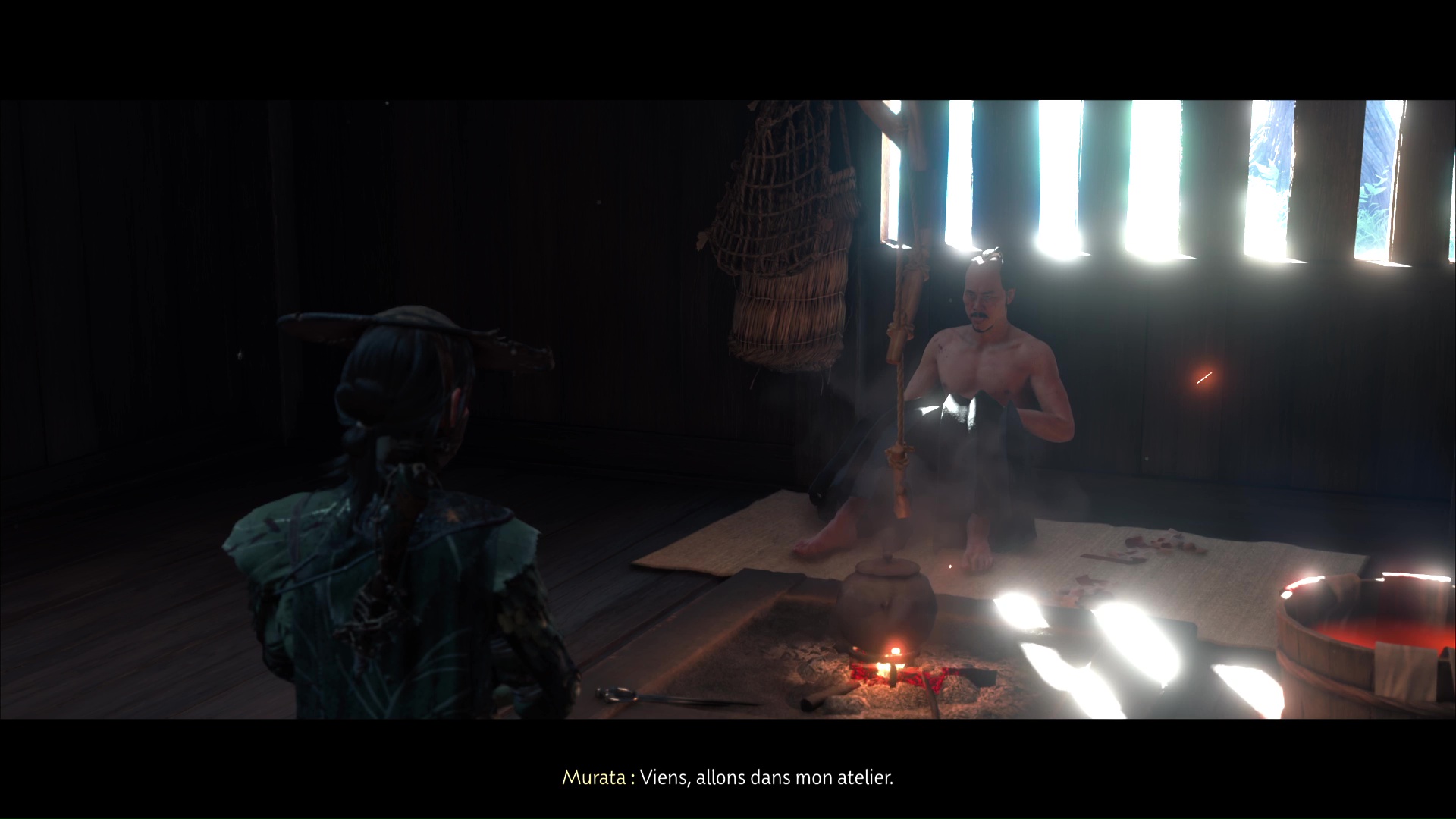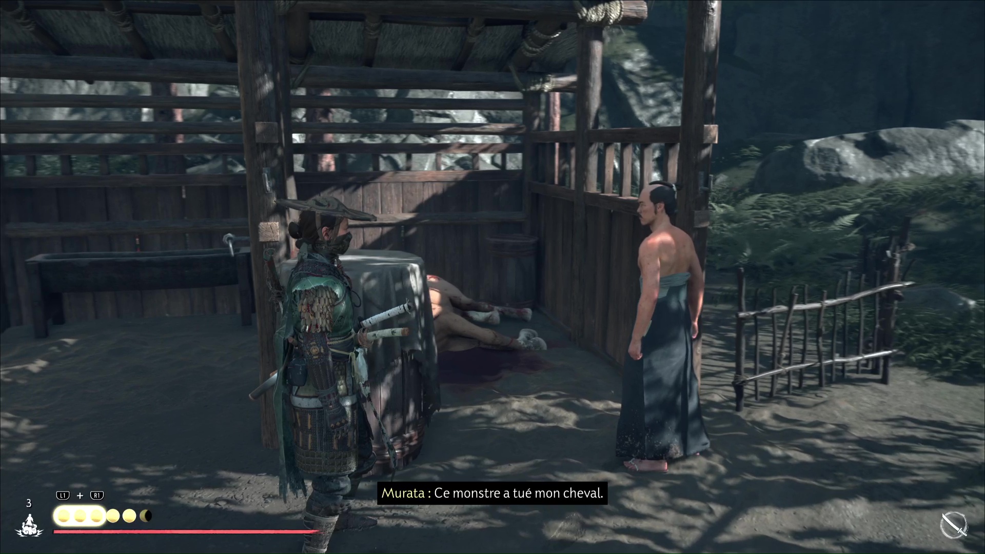 Approchez de la maison et ouvrez la porte. À l’intérieur, vous constaterez que Murata est mal en point. Parlez-lui pour apprendre qu’un de ses clients lui a tiré dessus. Il vous dira ensuite d’aller lui chercher du saké.