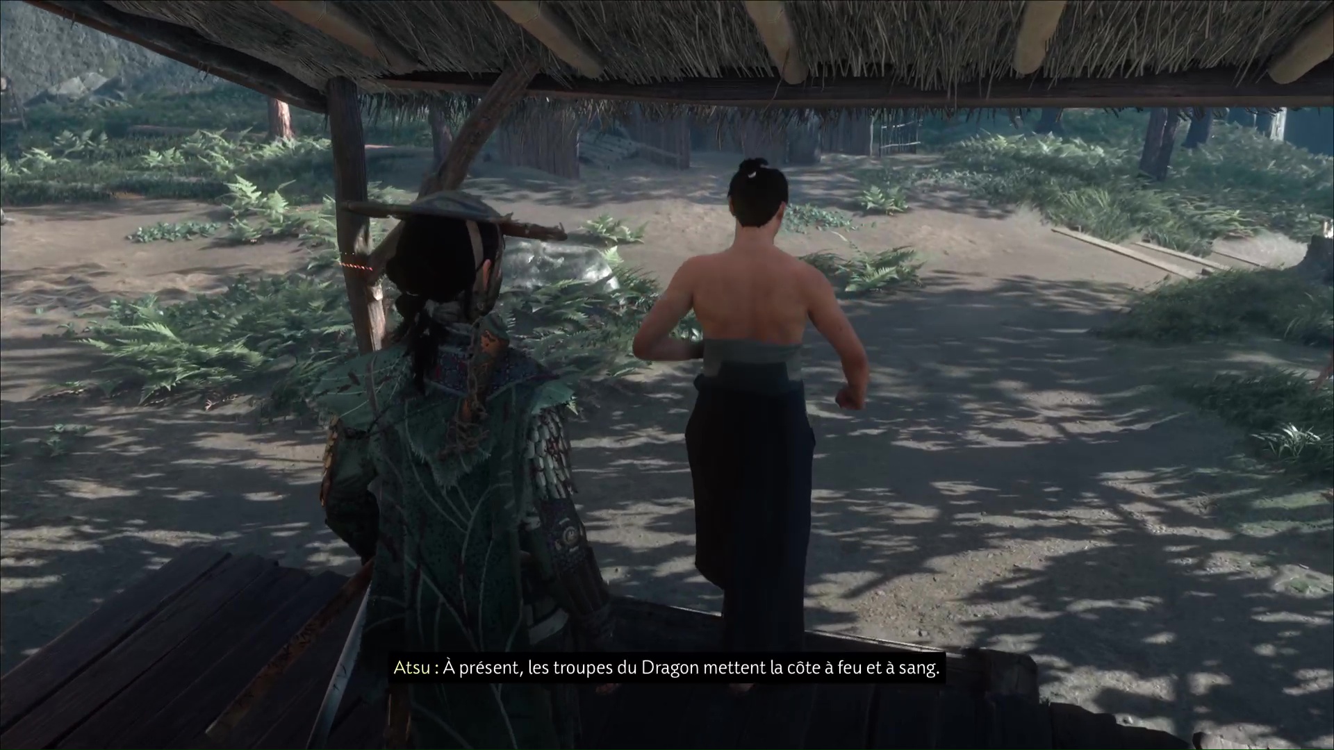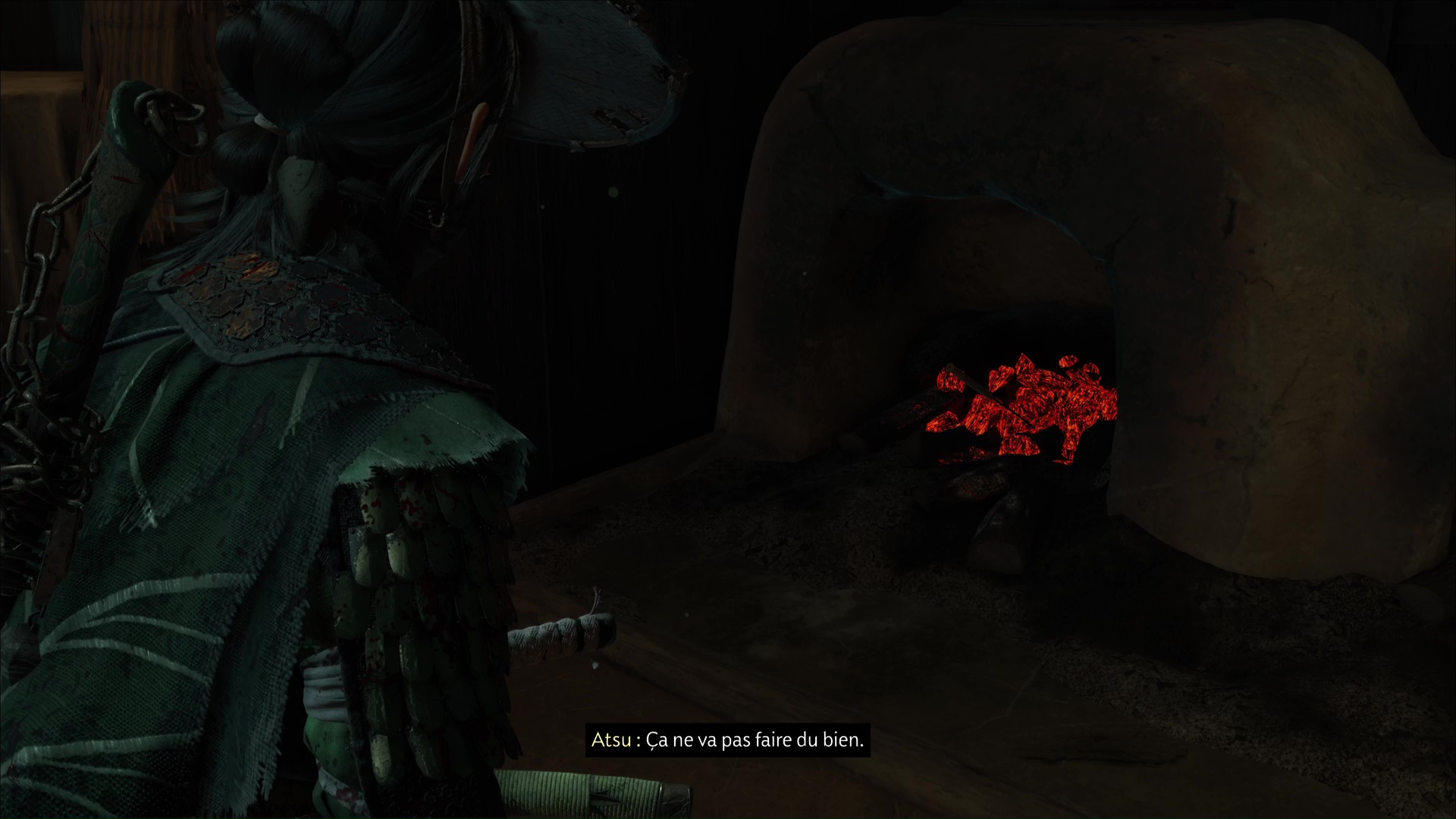 Dirigez-vous vers les braises juste à côté et examinez-les. Atsu va alors se charger de jouer les guérisseuses, non sans douleur pour notre pauvre homme.