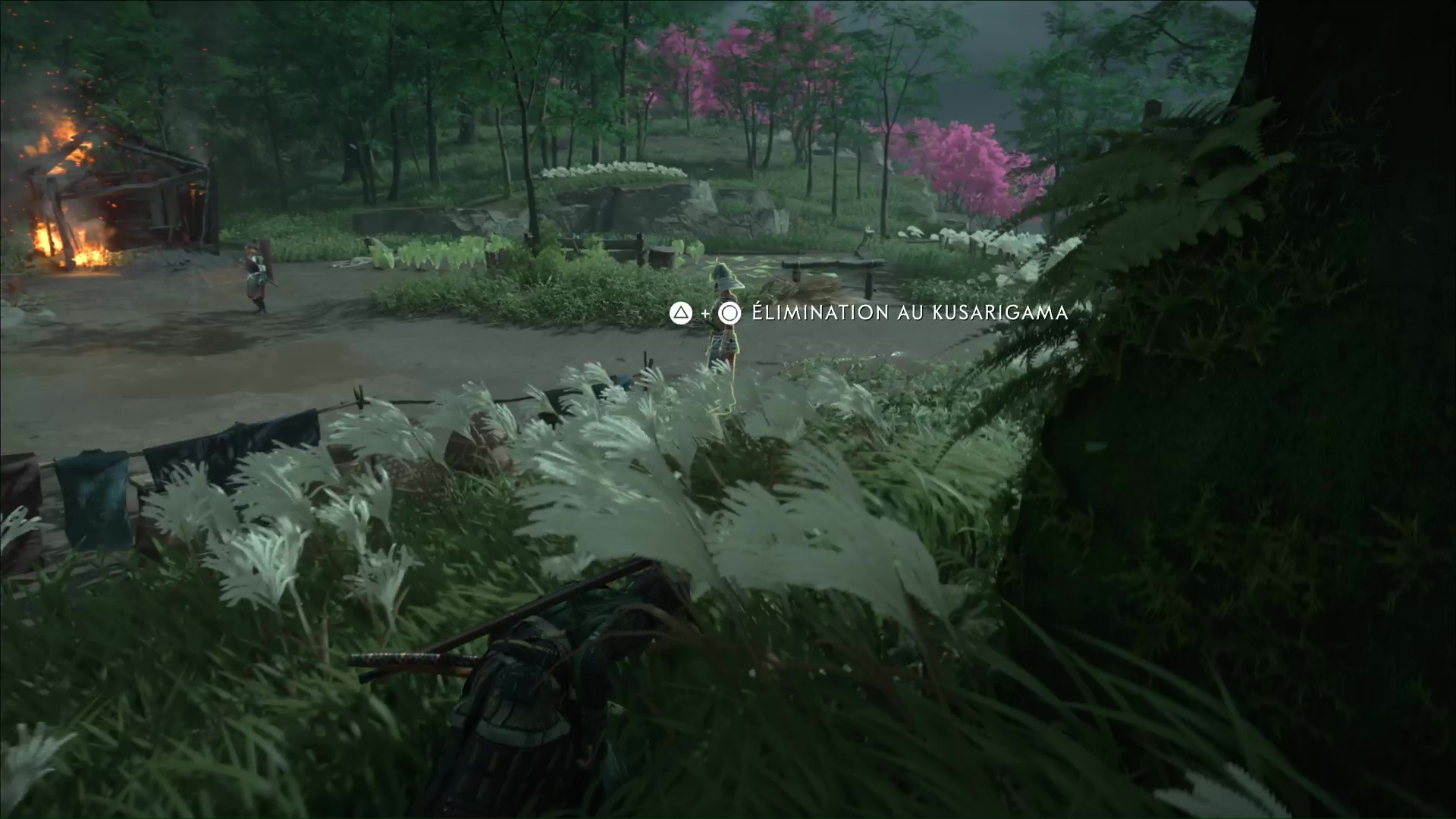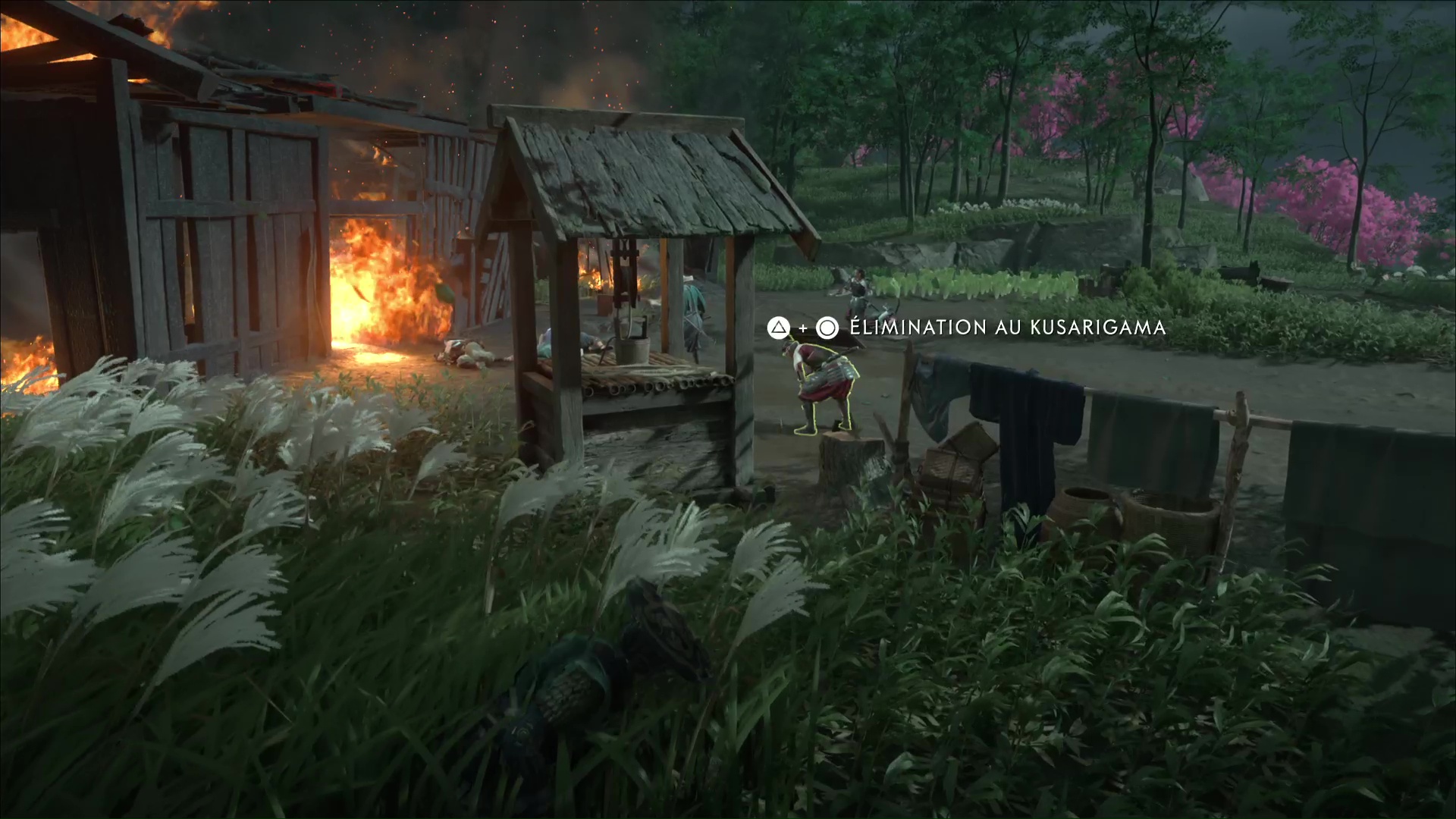Approchez discrètement et progressez caché dans des herbes hautes. Vous avez la possibilité d’éliminer l’homme habillé en bleu d’une exécution de kusarigama, si vous avez l’arme et la compétence, mais vous vous ferez repérer. Il est donc préférable d’éliminer ceux qui n’attireraient pas l’attention.