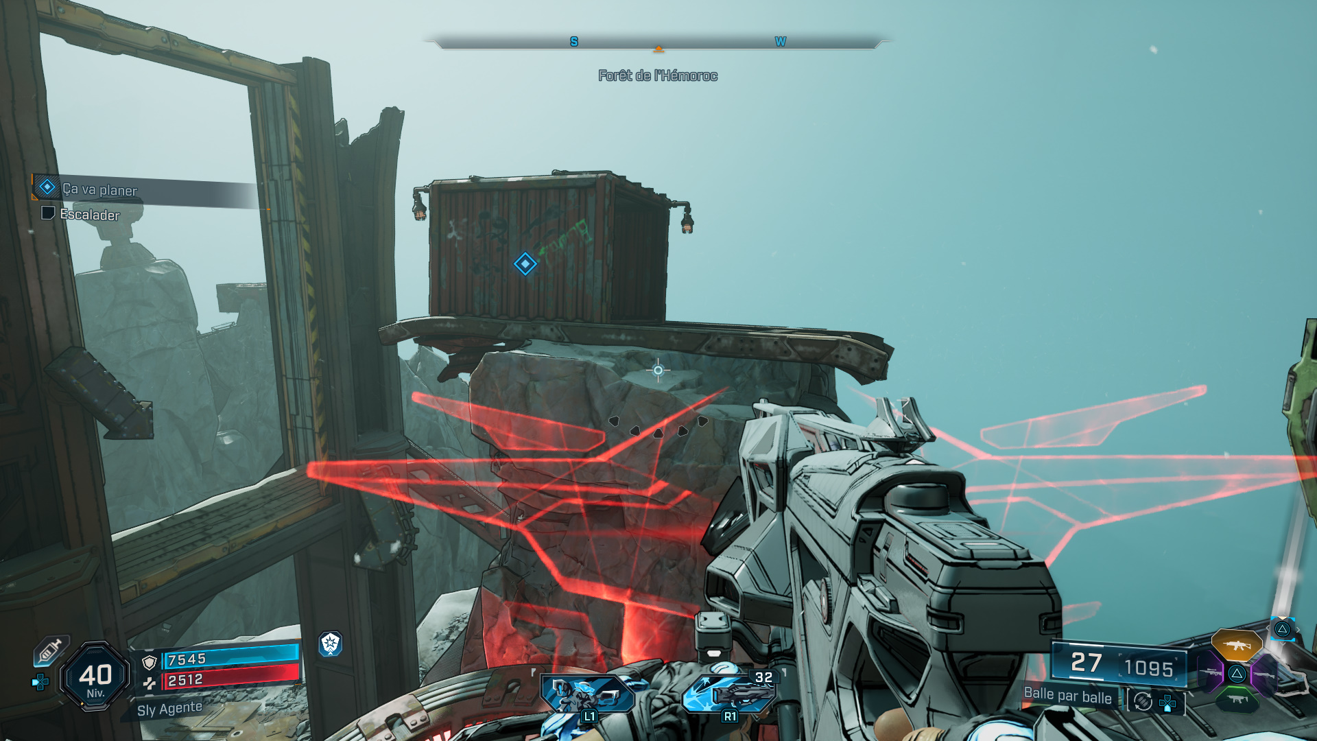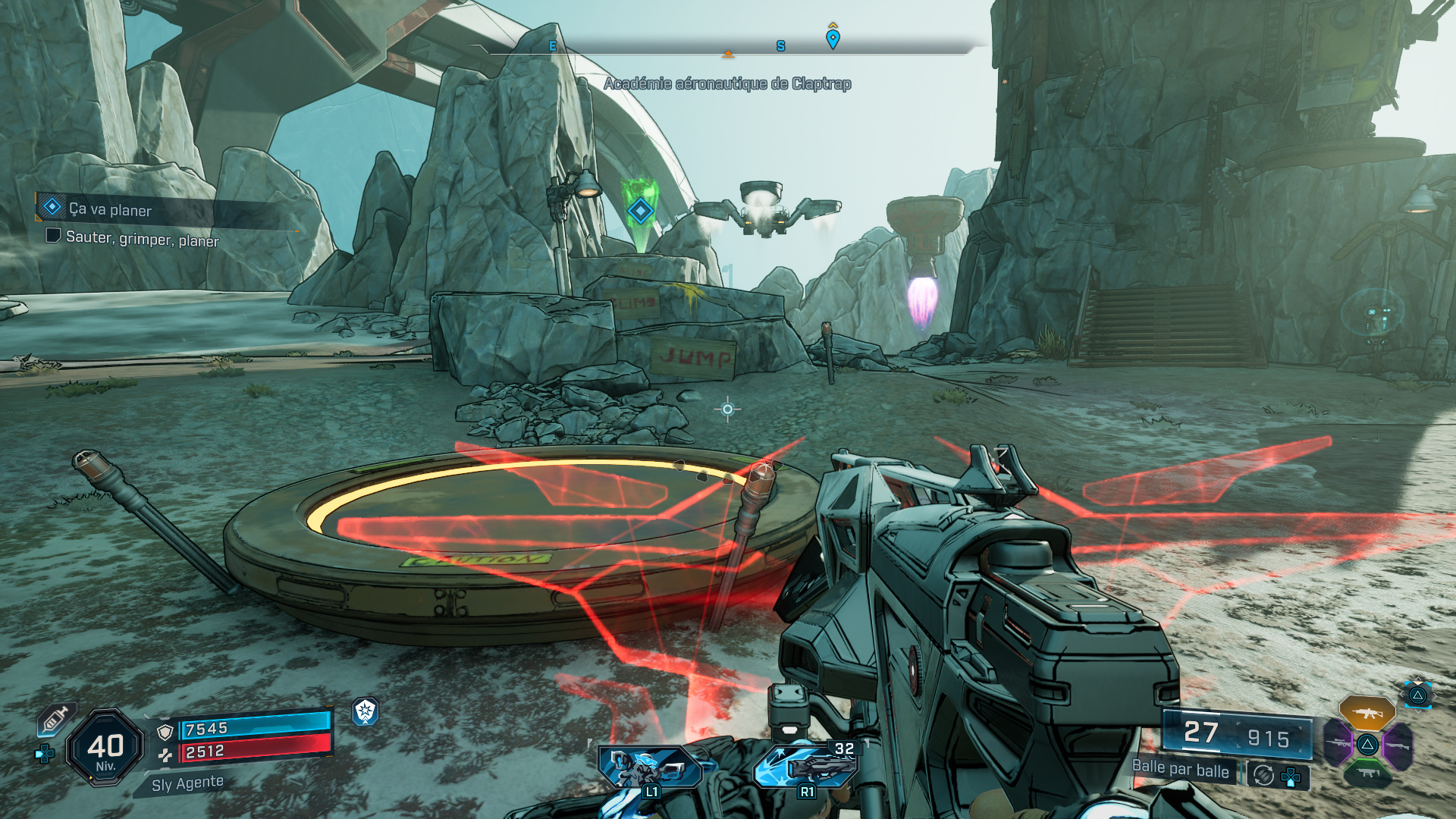 Avant d’attaquer les défis en question, Claptrap vous propose un petit échauffement qui consiste à sauter, puis à grimper pour finir en planant de manière à atteindre l’endroit indiqué. Dans la foulée, grimpez sur la plateforme en hauteur en escaladant la grille, puis planez à nouveau jusqu’à la prochaine plateforme indiquée, avant de revenir en arrière en planant vers une autre plateforme.
