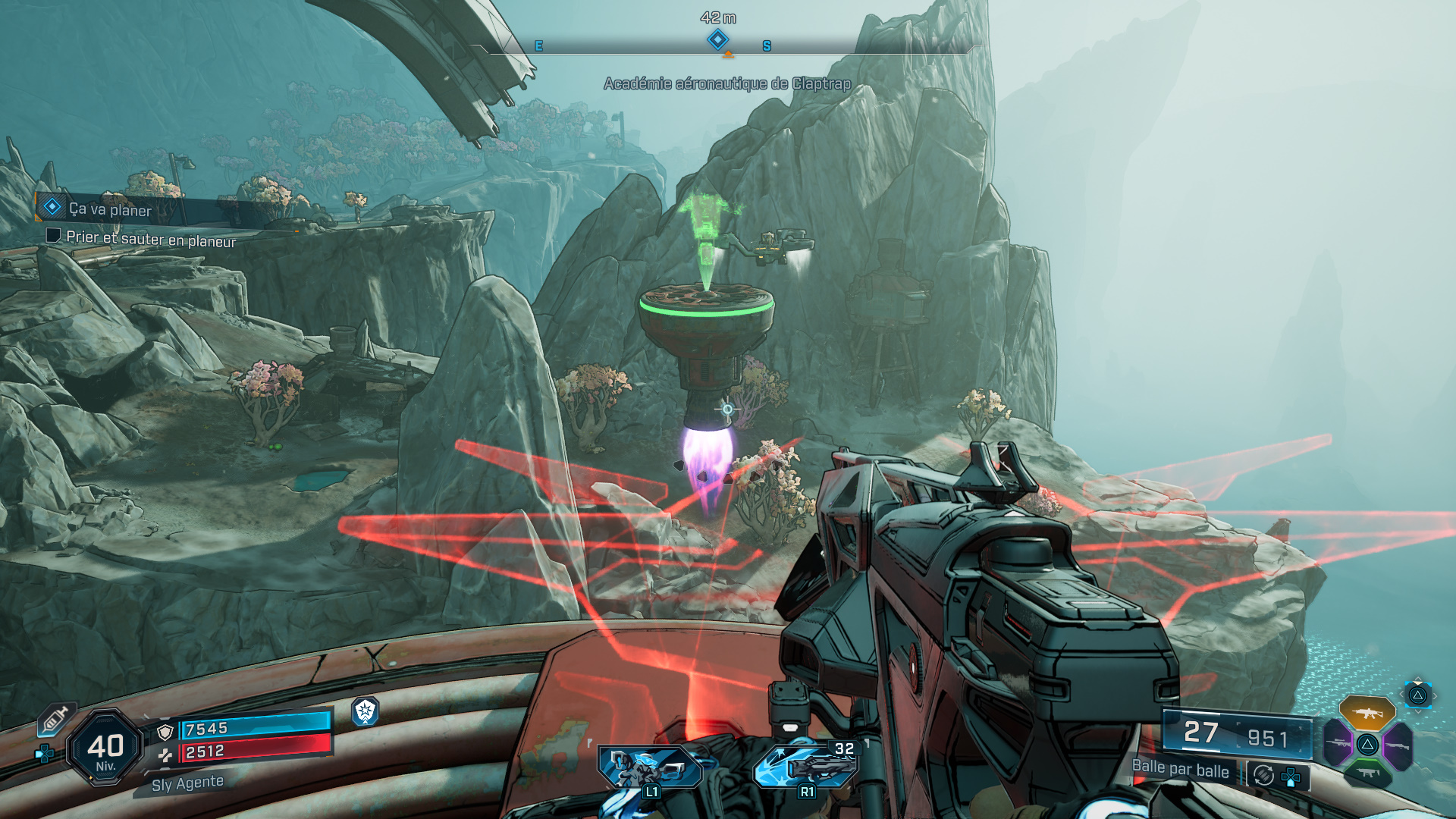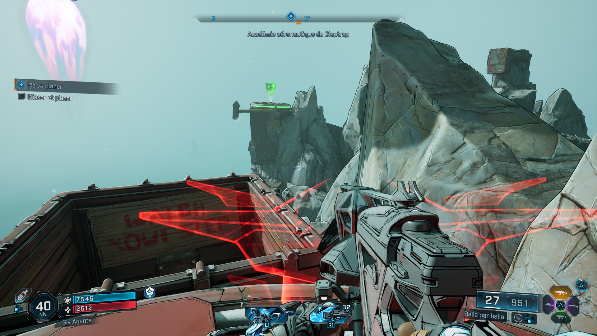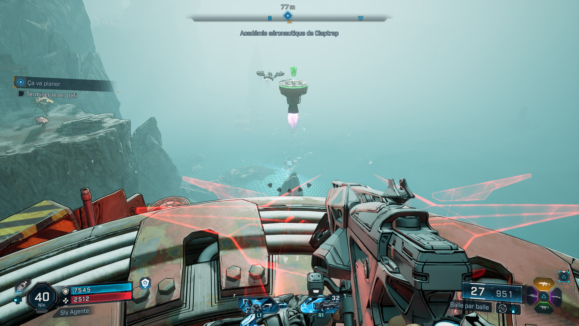 Rejoignez ensuite la ligne de départ du défi suivant un peu plus bas. Ici, commencez par vous servir des courants d’air ascendants pour prendre suffisamment de hauteur et planez jusqu’à une première plateforme, puis une deuxième. Juste avant de vous laisser glisser pour planer au-dessus de Claptrap et enchaîner sur d’autres pentes menant vers une autre plateforme.