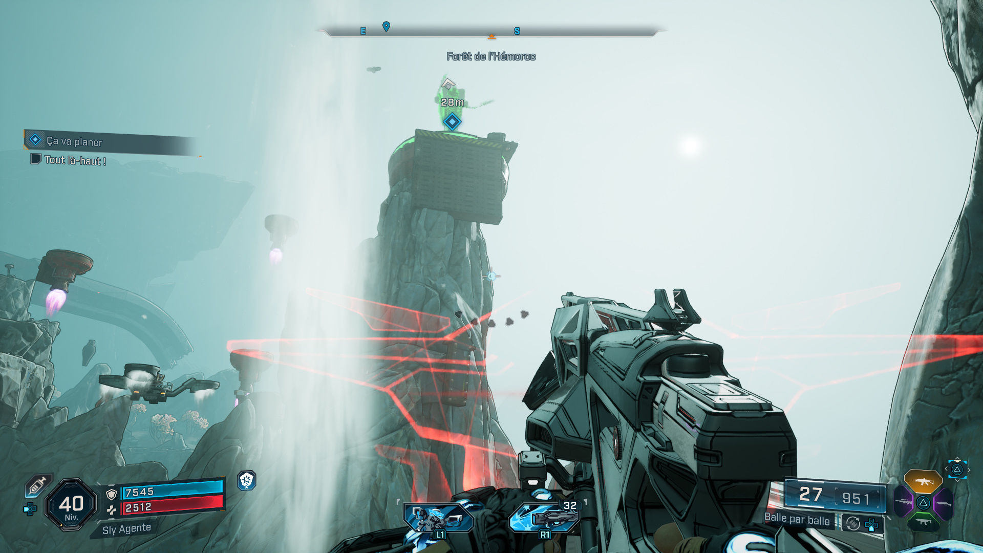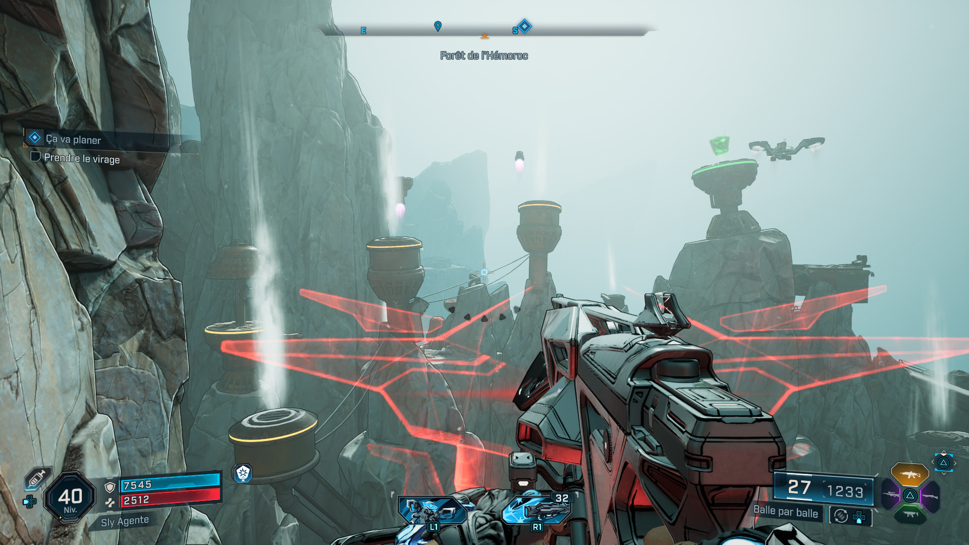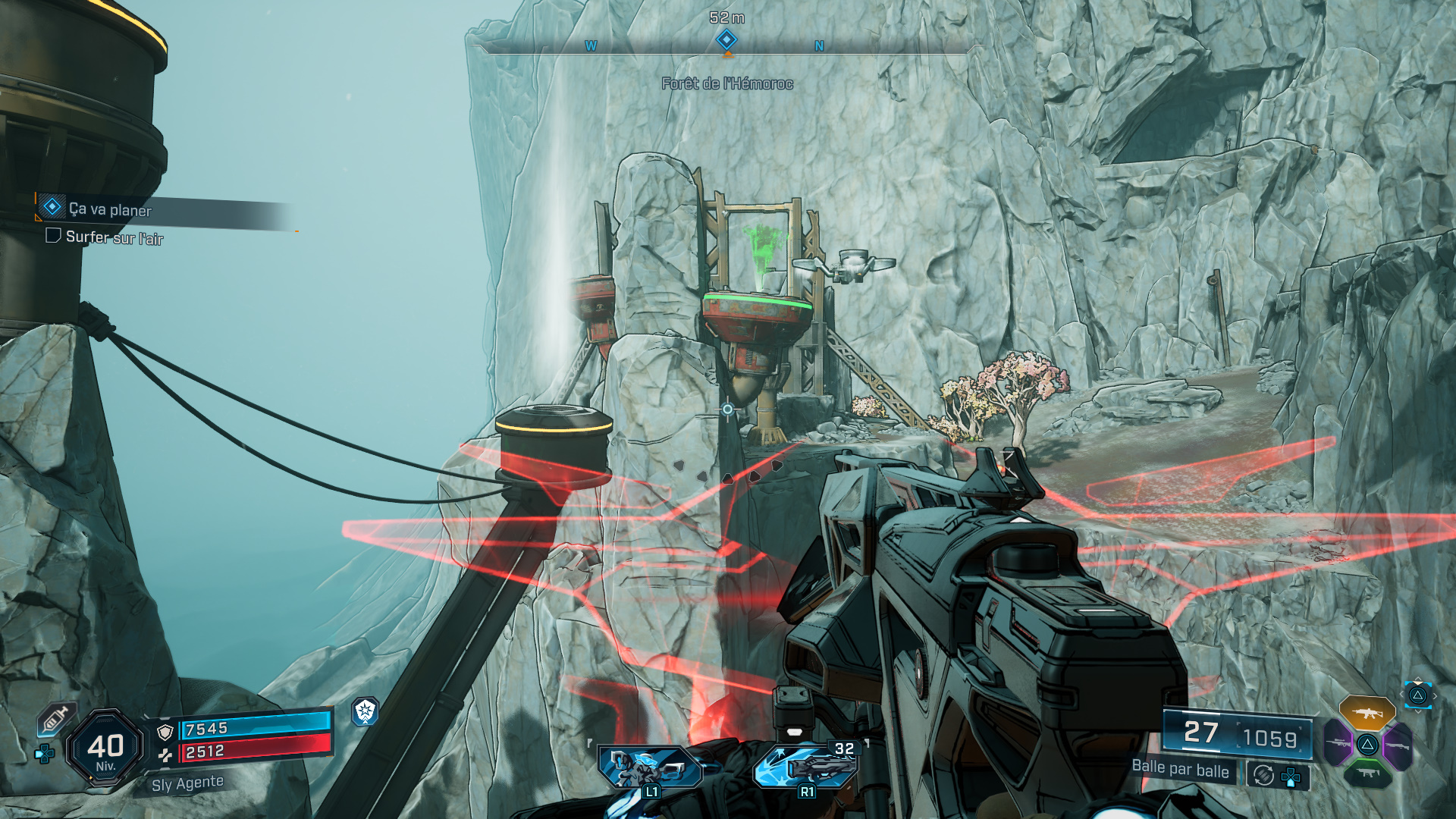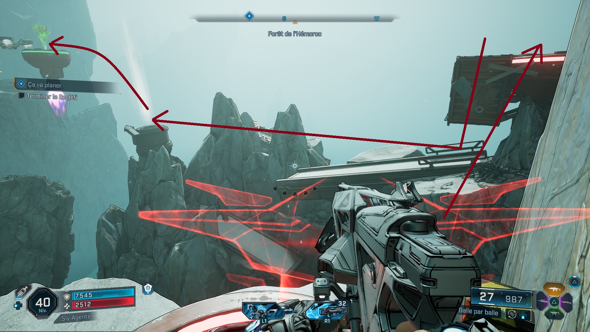Rejoignez ensuite la ligne de départ du défi suivant un peu plus bas. Ici, commencez par vous servir des courants d’air ascendants pour prendre suffisamment de hauteur et planez jusqu’à une première plateforme, puis une deuxième. Juste avant de vous laisser glisser pour planer au-dessus de Claptrap et enchaîner sur d’autres pentes menant vers une autre plateforme.