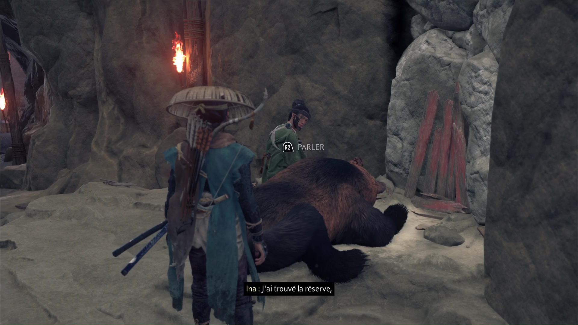 À partir d’ici, soyez vigilant car un ours garde les lieux. Avant qu’il ne vous voie et en restant à distance, sortez le yumi votre arc lourd, et lancez une flèche tendue dans la tête de l’animal. Ina va ensuite fouiller et localiser la réserve. Elle se trouve derrière un mur destructible. Reculez et lancez une bombe dessus pour ouvrir la voie.