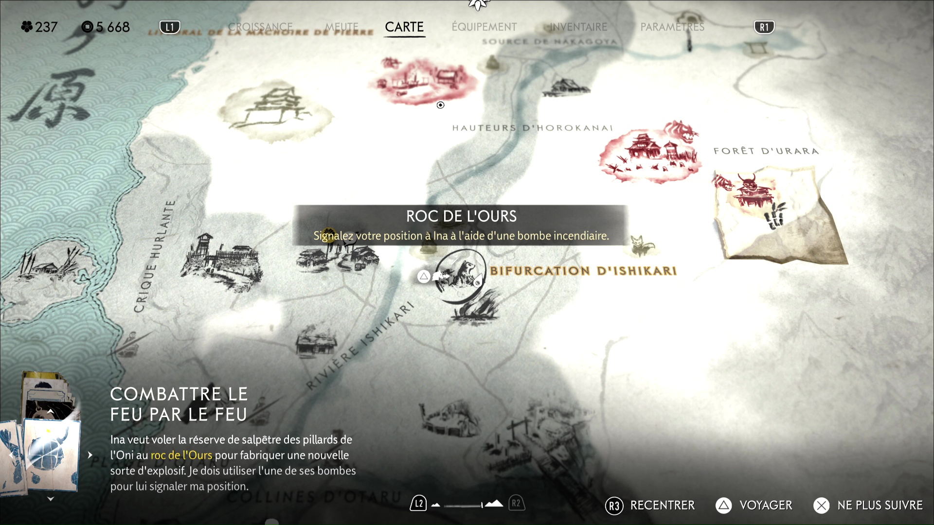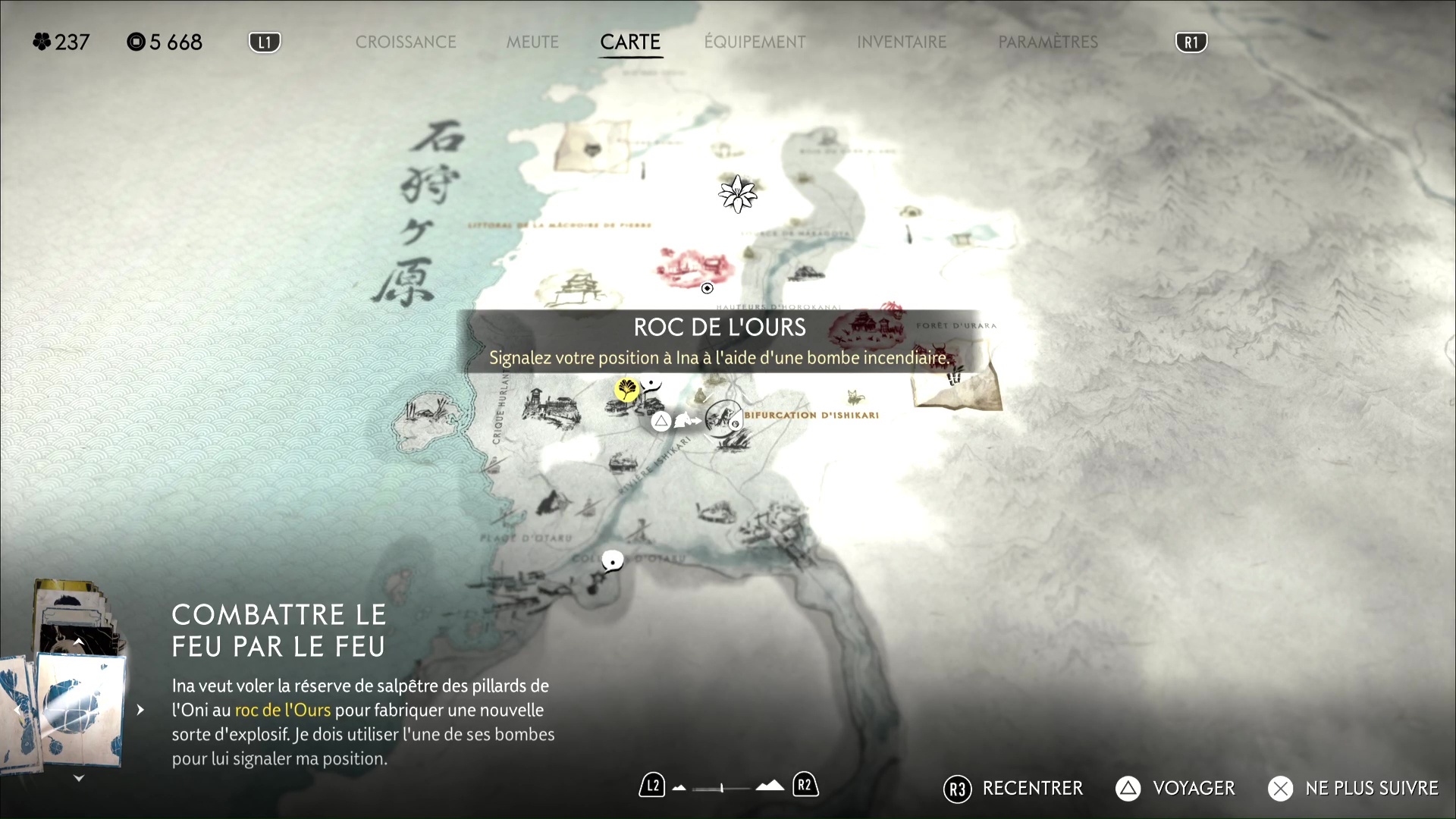 Le Roc de l’Ours se trouve à l’est du Marché d’Ishikari et seulement quelques pas au nord du Village d’Iwami. Une fois à destination, et lorsque le jeu vous le suggèrera, lancez une bombe incendiaire pour signaler à Ina que vous êtes là.