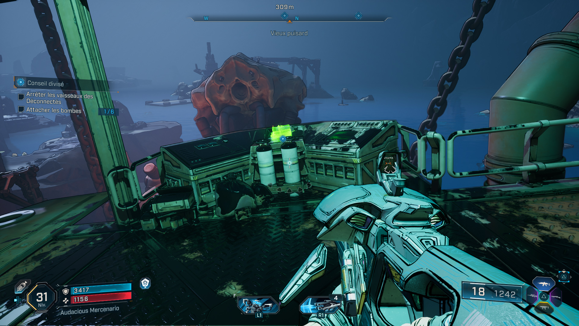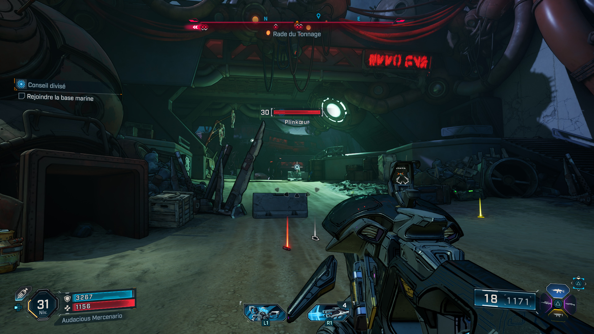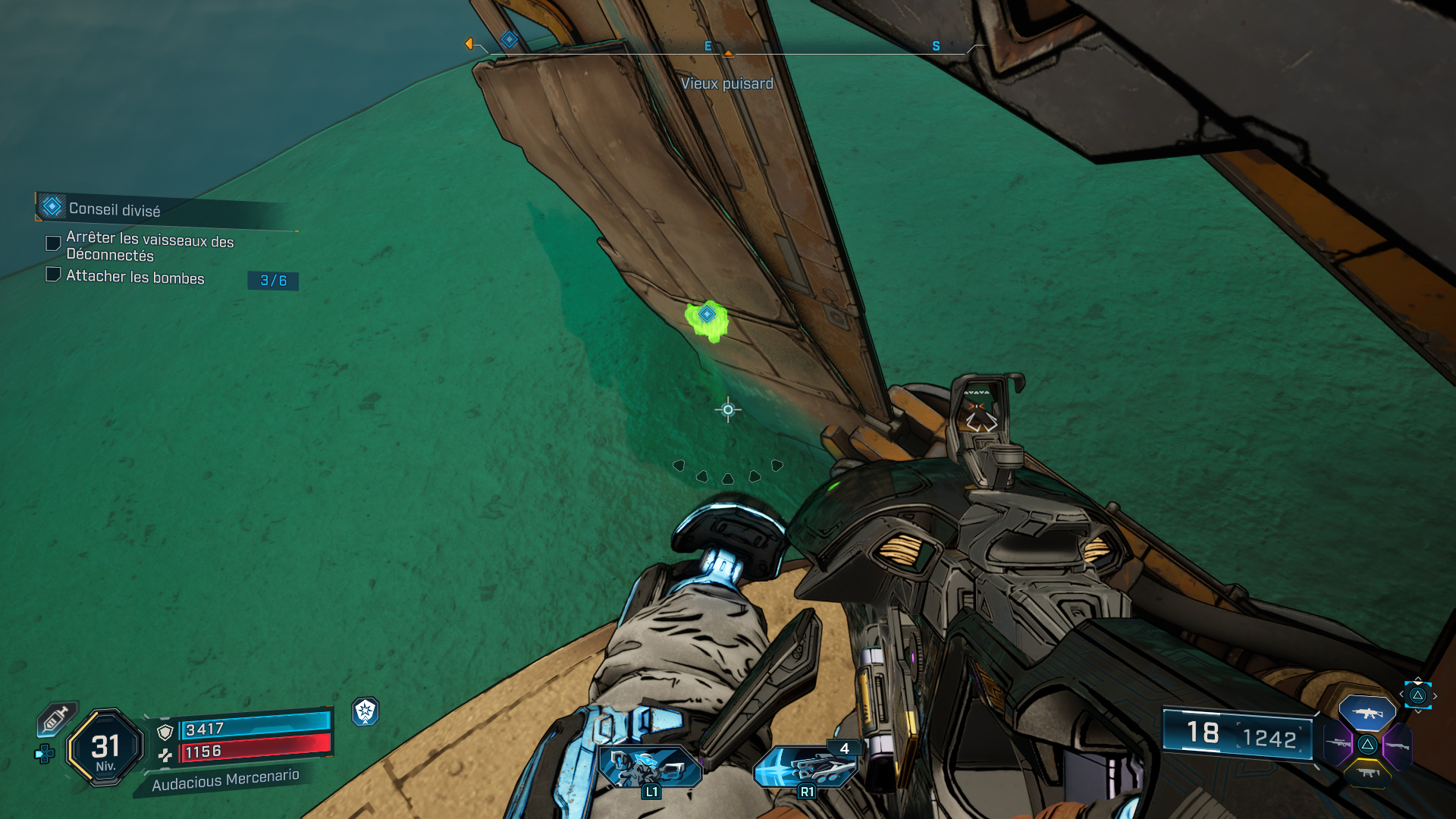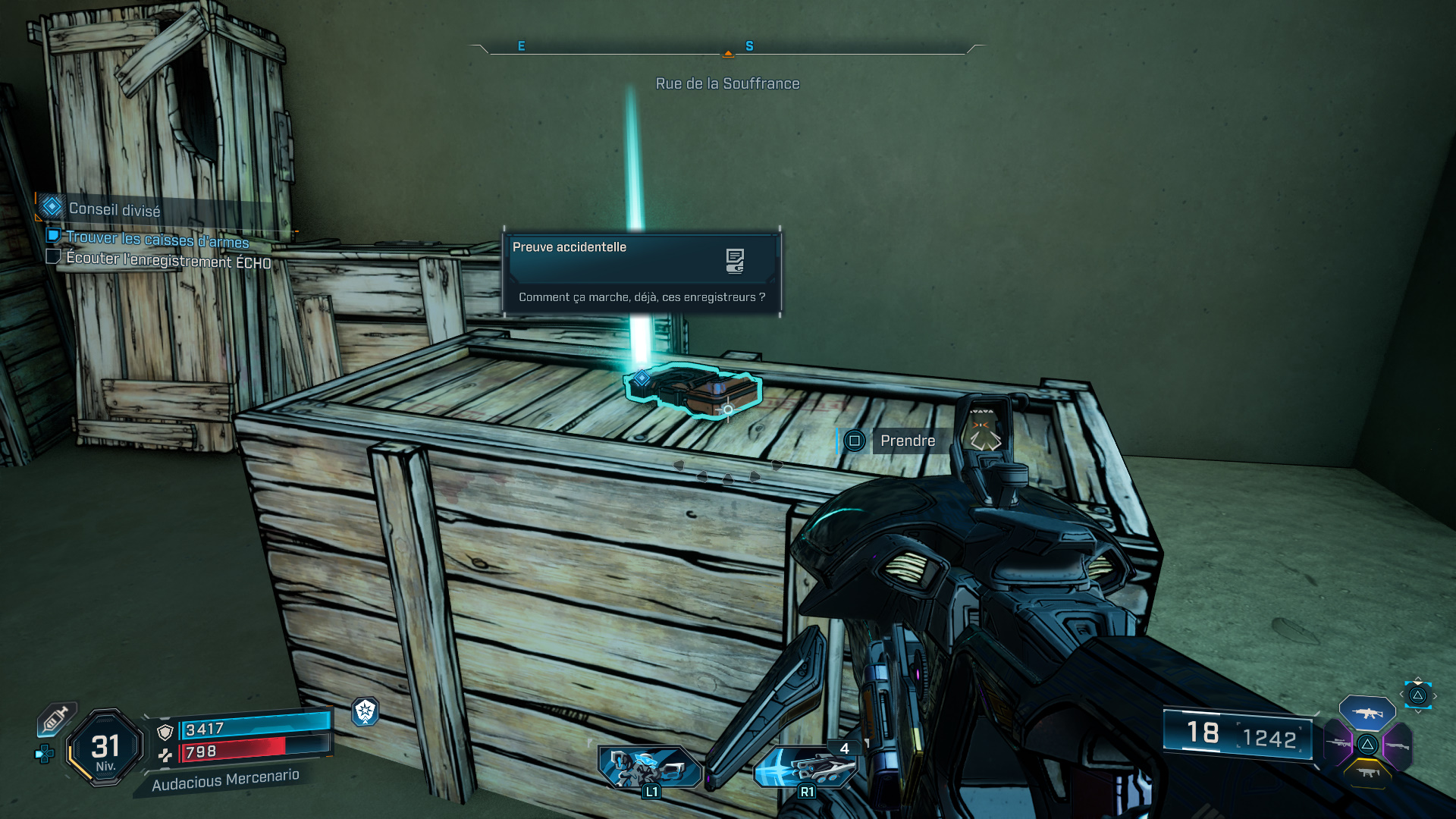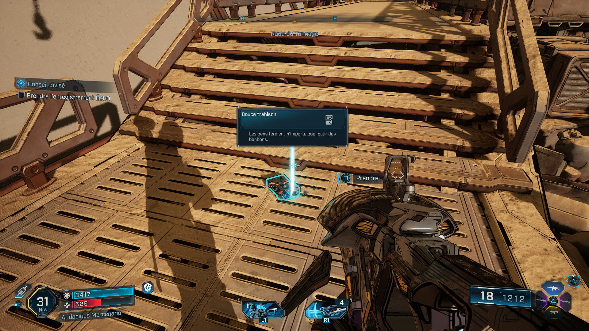 Ce qui n’est pas du tout au goût d’un certain Viandard, et c’est en redescendant dans la base marine que vous devez l’affronter, entouré de quelques acolytes. Une fois mort, ramassez l’enregistrement ECHO « Douce trahison » qu’il laisse tomber, et écoutez son message pour terminer cette mission de faction.