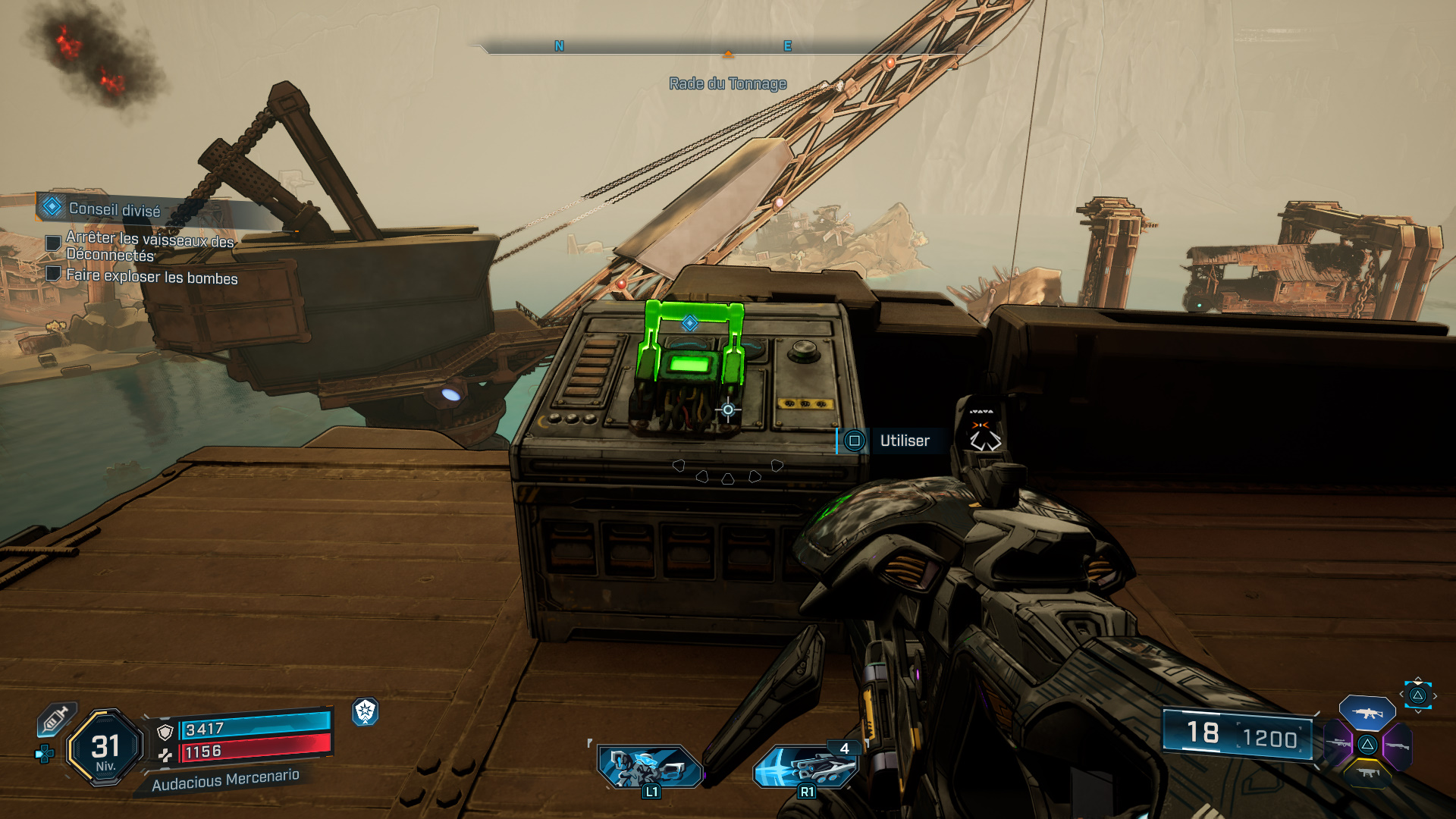 De là, retournez-vous et levez les yeux pour apercevoir un point d’accroche en hauteur. Utilisez votre grappin pour atteindre la plateforme et actionnez l’interrupteur pour faire exploser les navires.