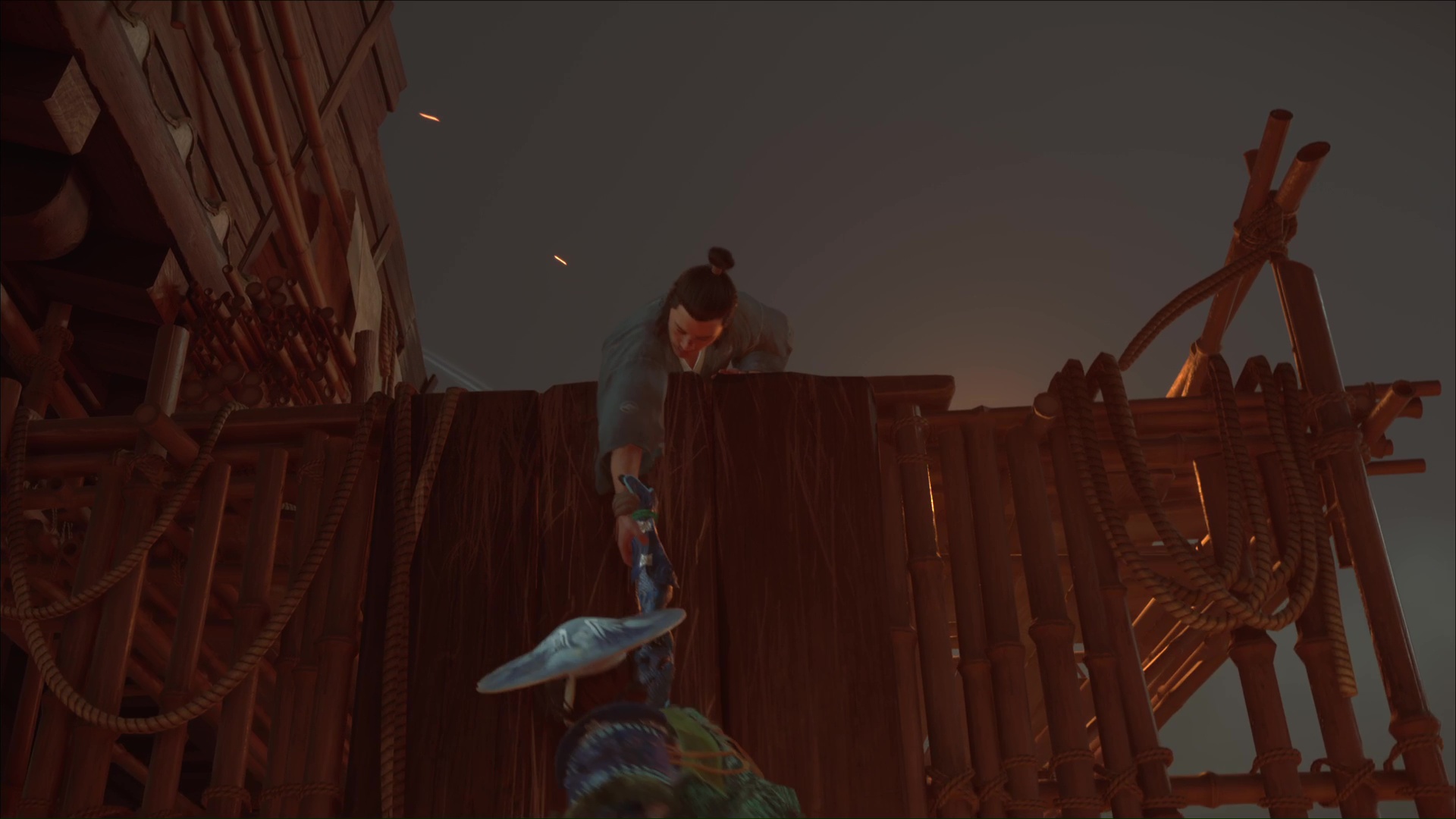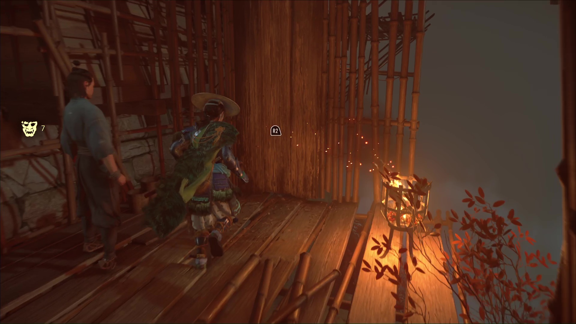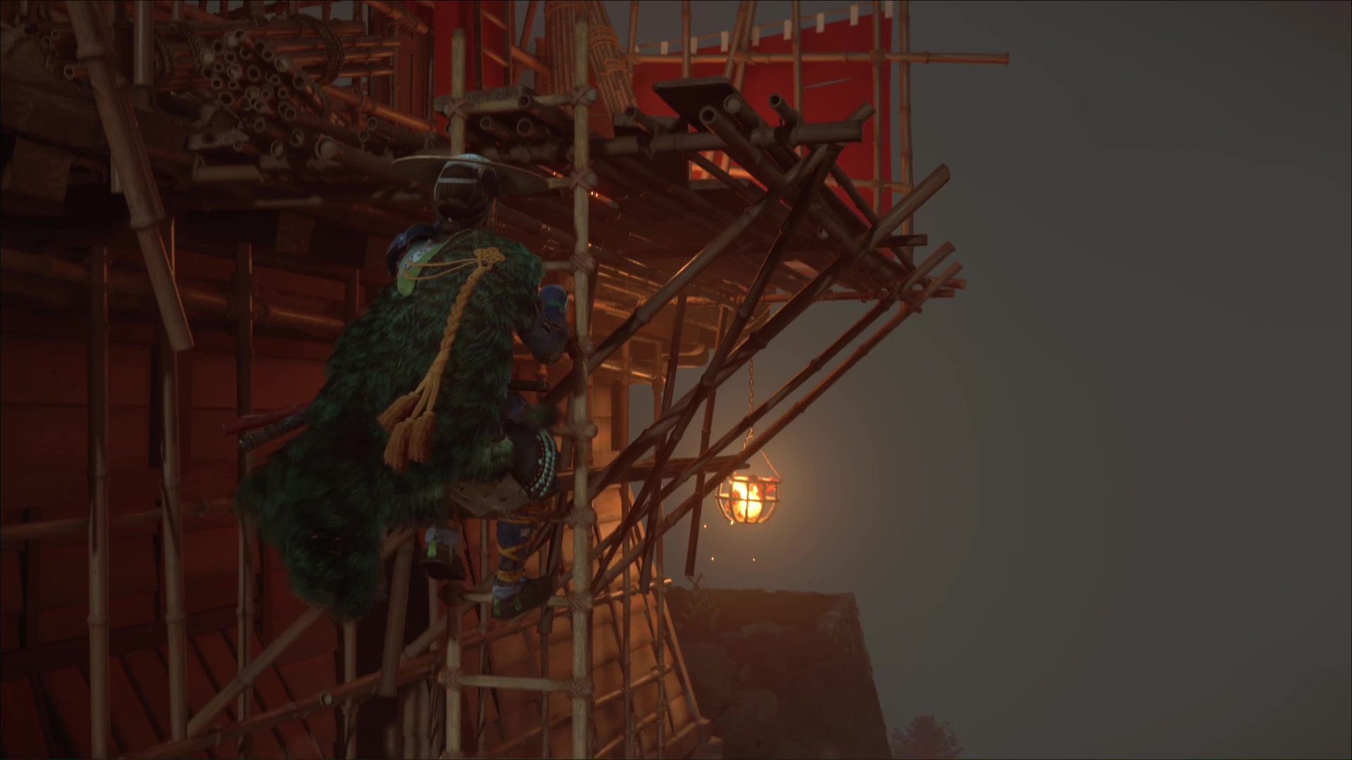 Pour démarrer l’ascension du donjon, approchez du panneau à côté de Jubei pour le faire passer au niveau supérieur. Vous serez hissé à votre tour dans la foulée. En haut, sautez sur le fagot de bambous qui dépasse.
