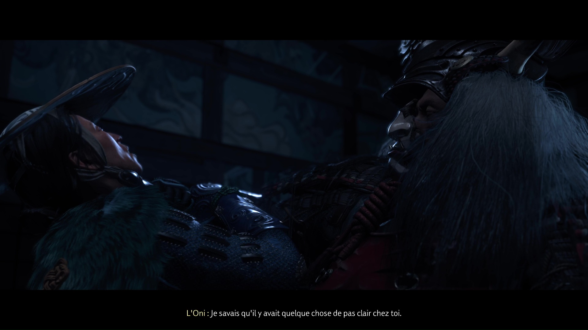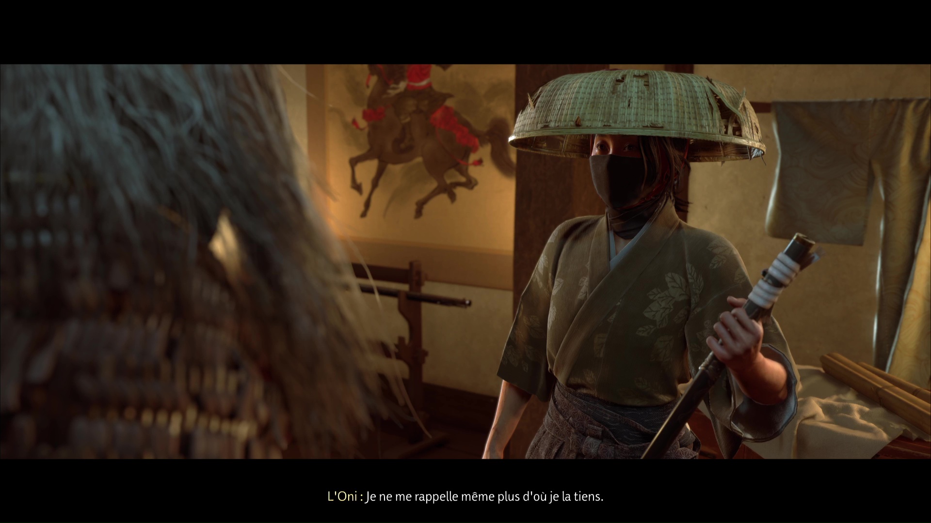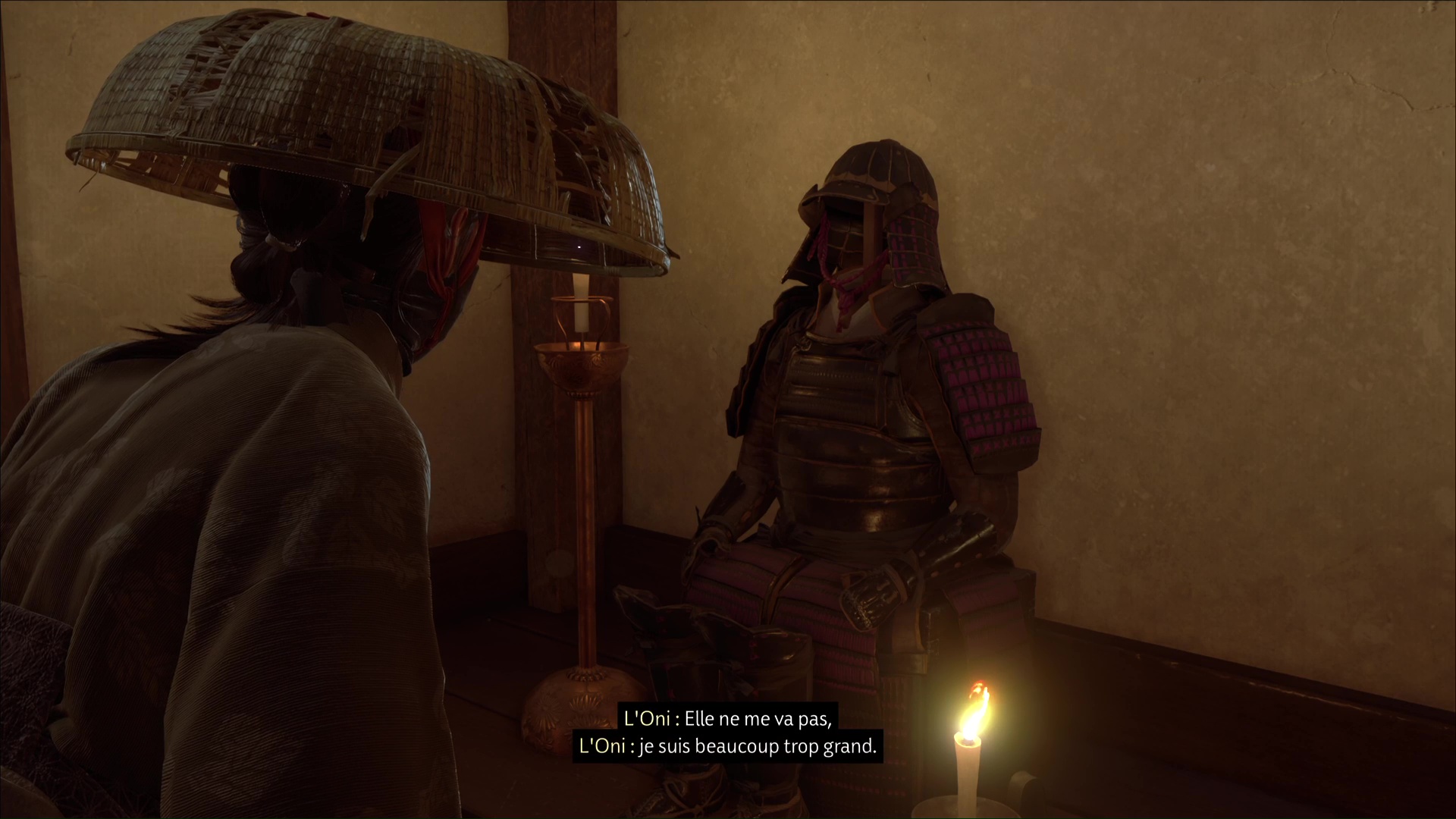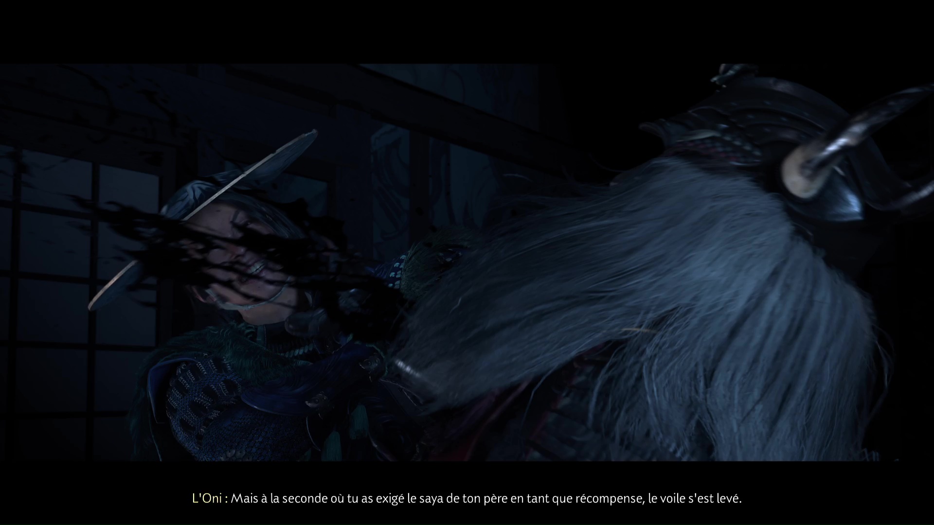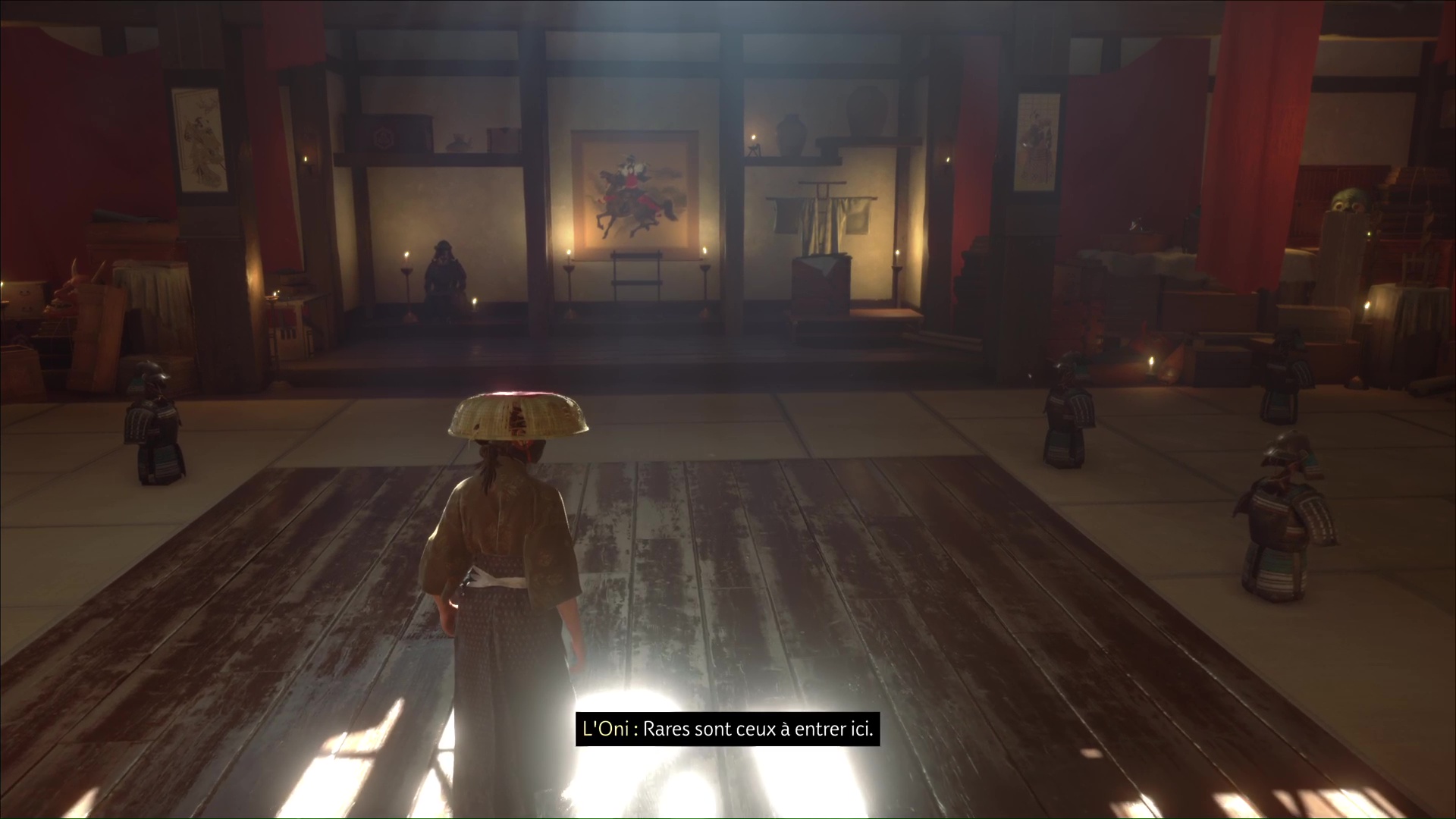 Juste après, vous débarquez dans la salle privée de l’Oni. Ce dernier vous invite d’ailleurs à observer sa collection. Vous pouvez en effet vous renseigner sur les différentes pièces, mais la plus importante est en fait ce saya posé sur un meuble, à droite.