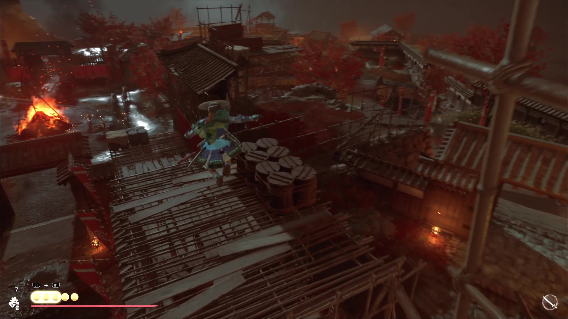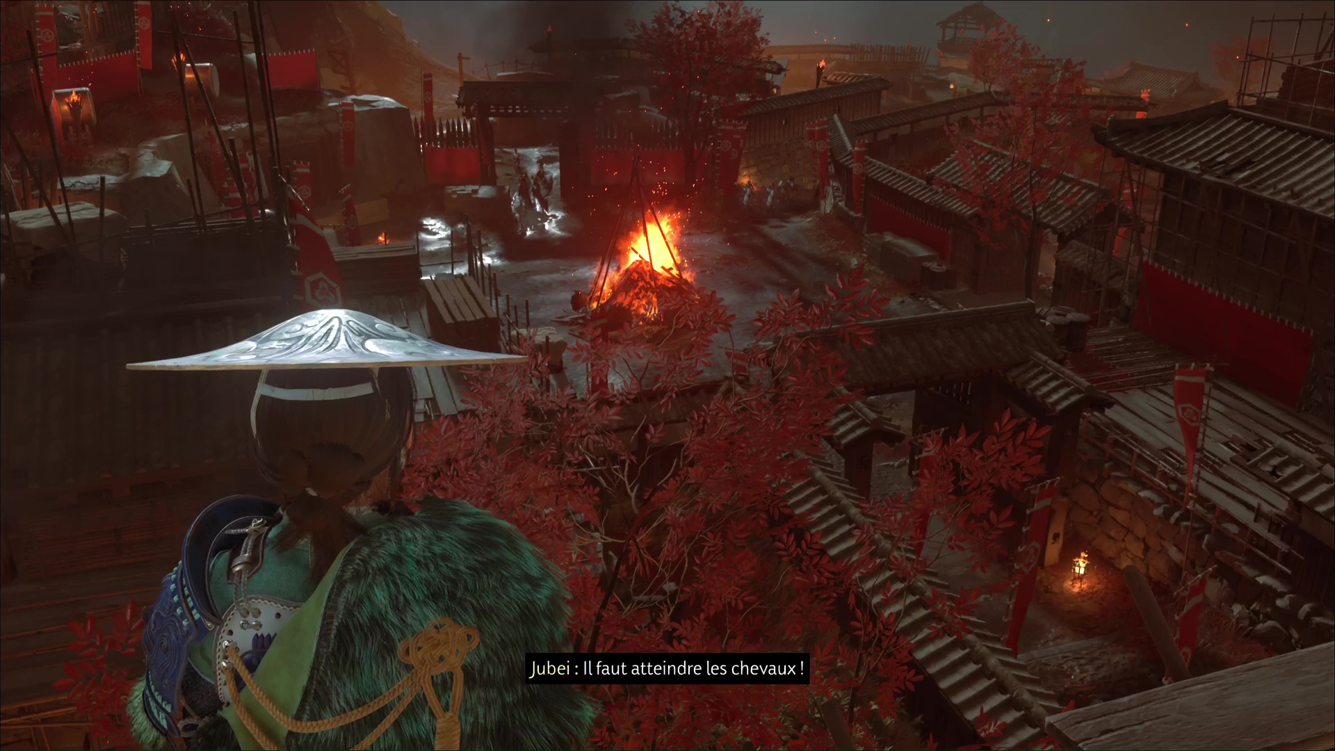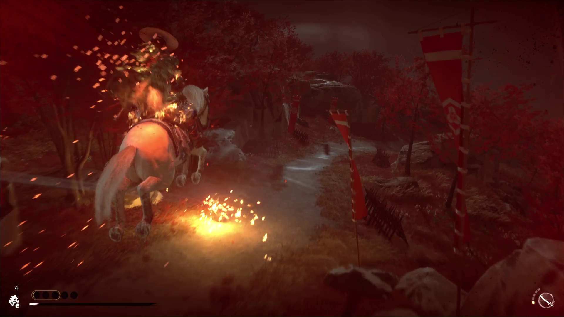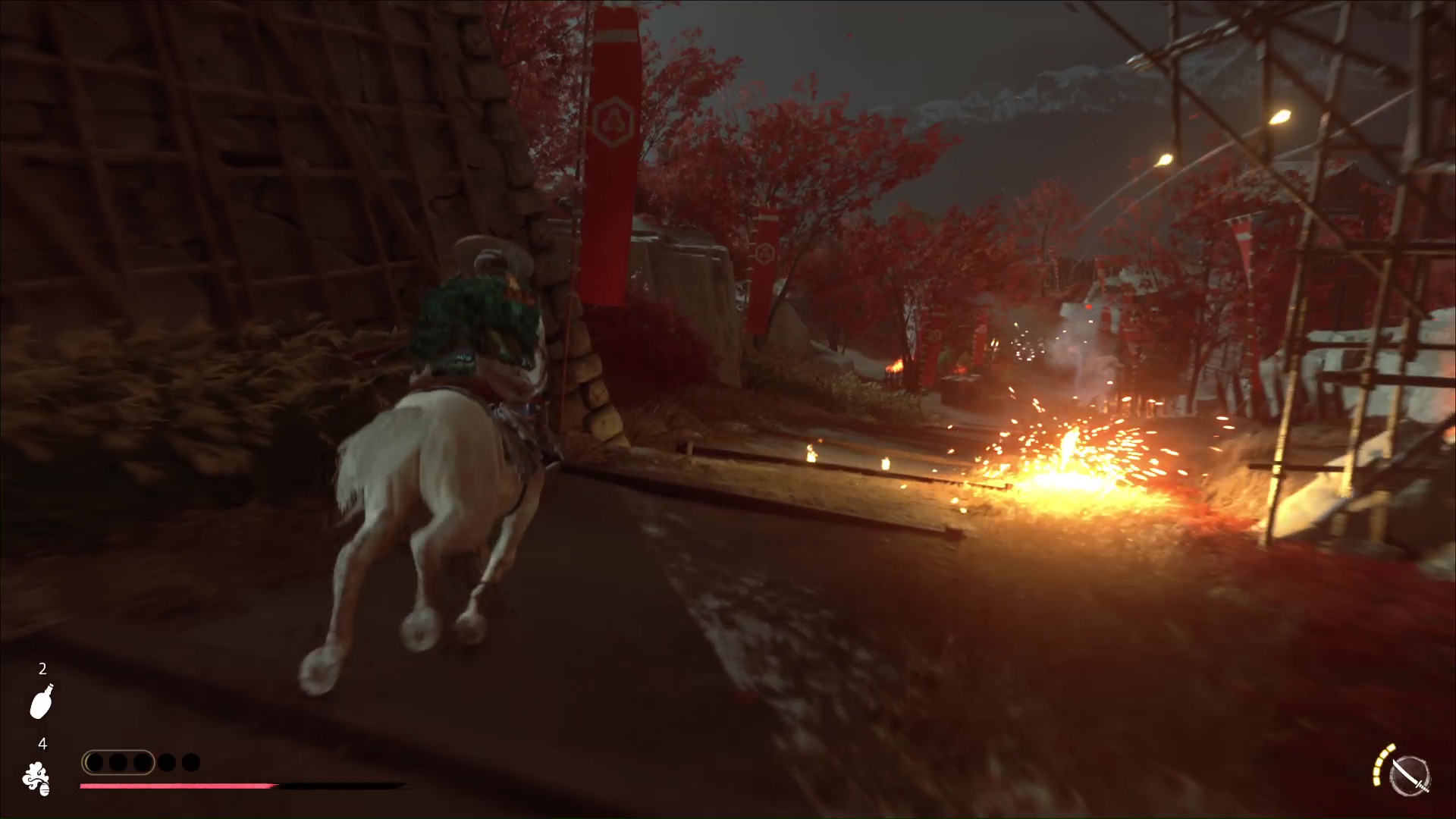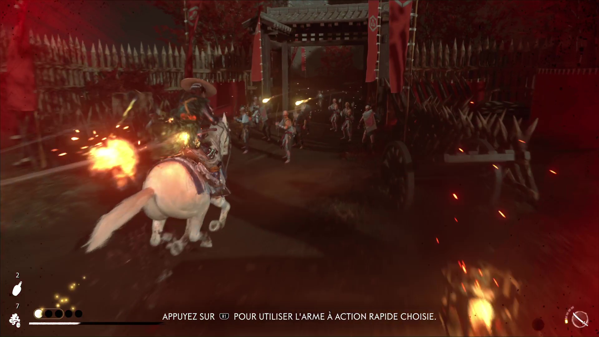 Juste après, vous devrez slalomer entre des tirs de bō-hiya, autrement dit des projectiles explosifs. Terminez le parcours en sautant avec votre cheval et en galopant encore quelques instants en évitant le feu, afin d’être enfin en sécurité.