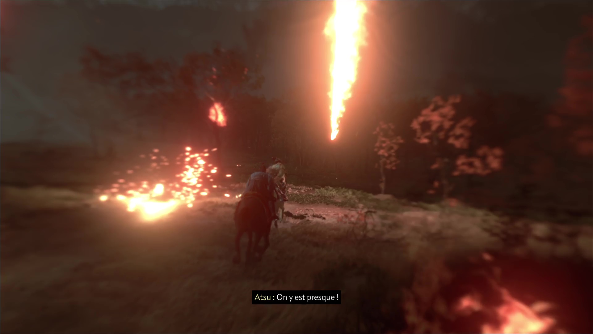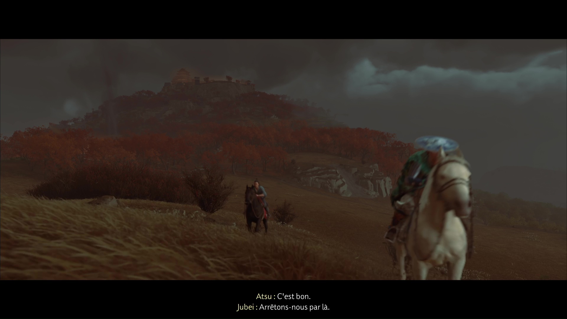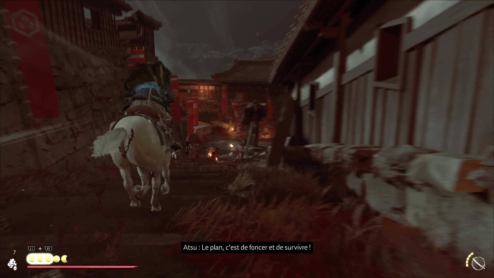 Atsu va alors mal se réceptionner et tituber quelques instants. Avancez et passez à travers l’ouverture devant vous. De l’autre côté, montez sur un cheval et apprêtez-vous à utiliser un nouveau mouvement.