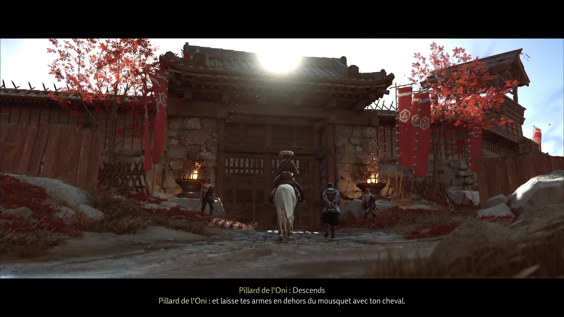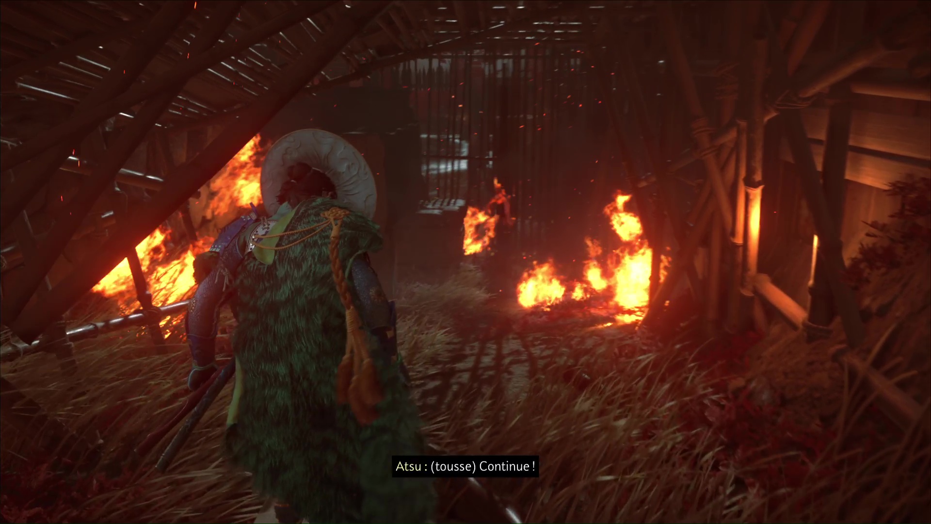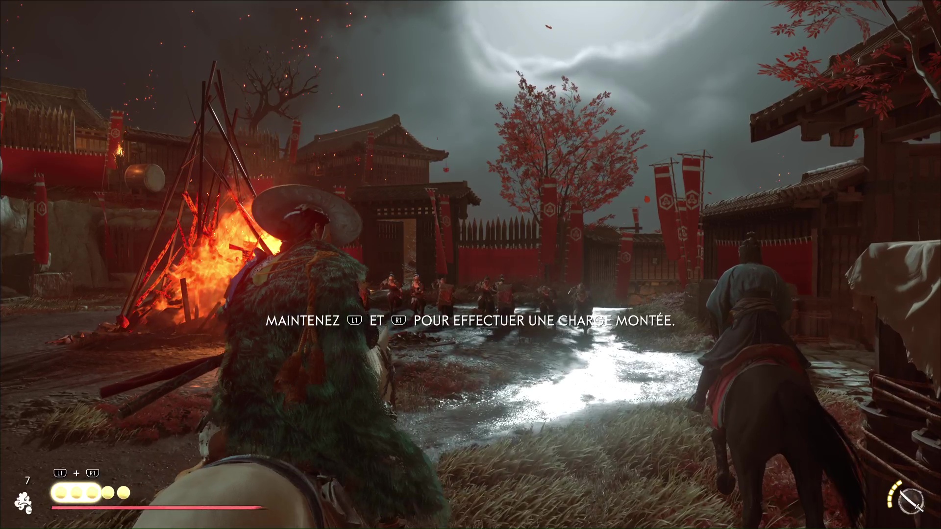 Atsu va alors mal se réceptionner et tituber quelques instants. Avancez et passez à travers l’ouverture devant vous. De l’autre côté, montez sur un cheval et apprêtez-vous à utiliser un nouveau mouvement.