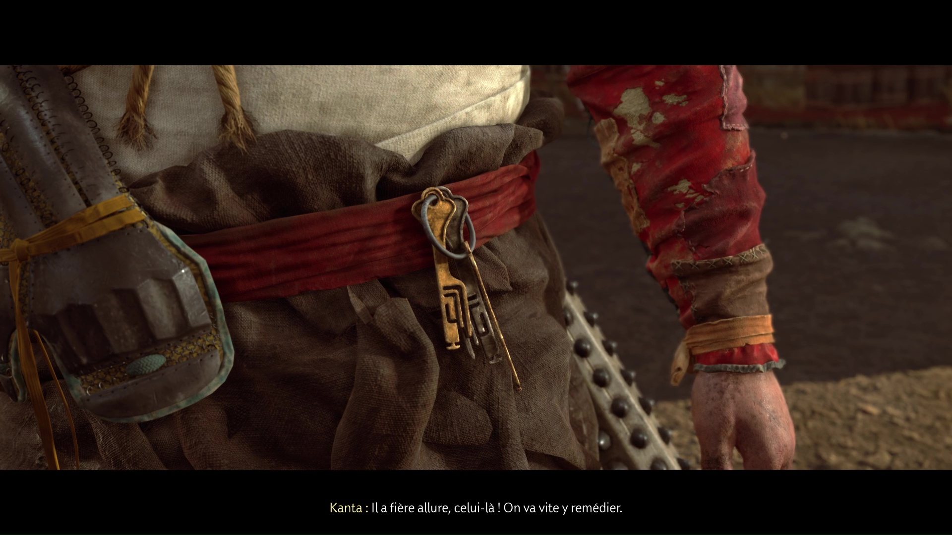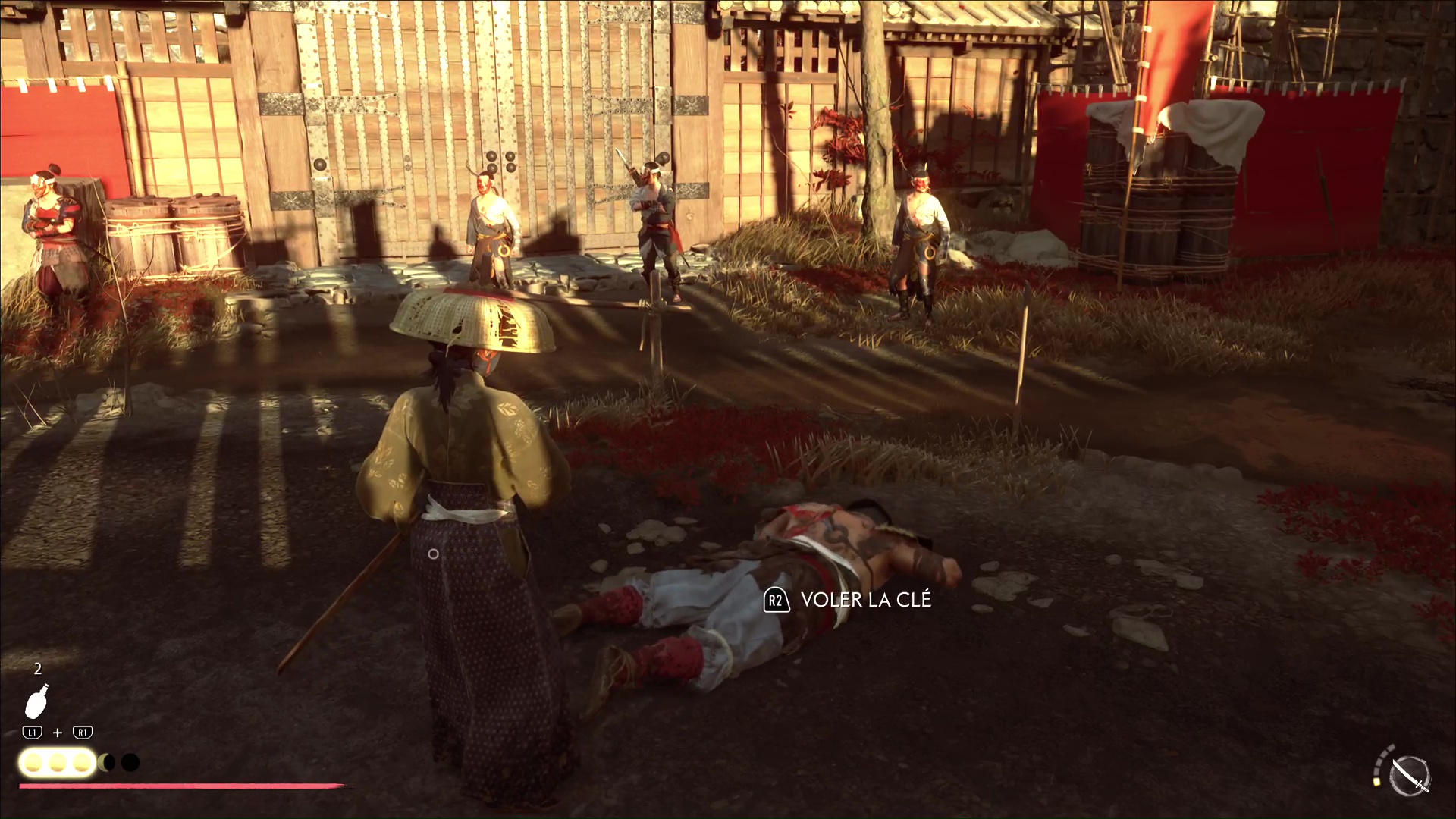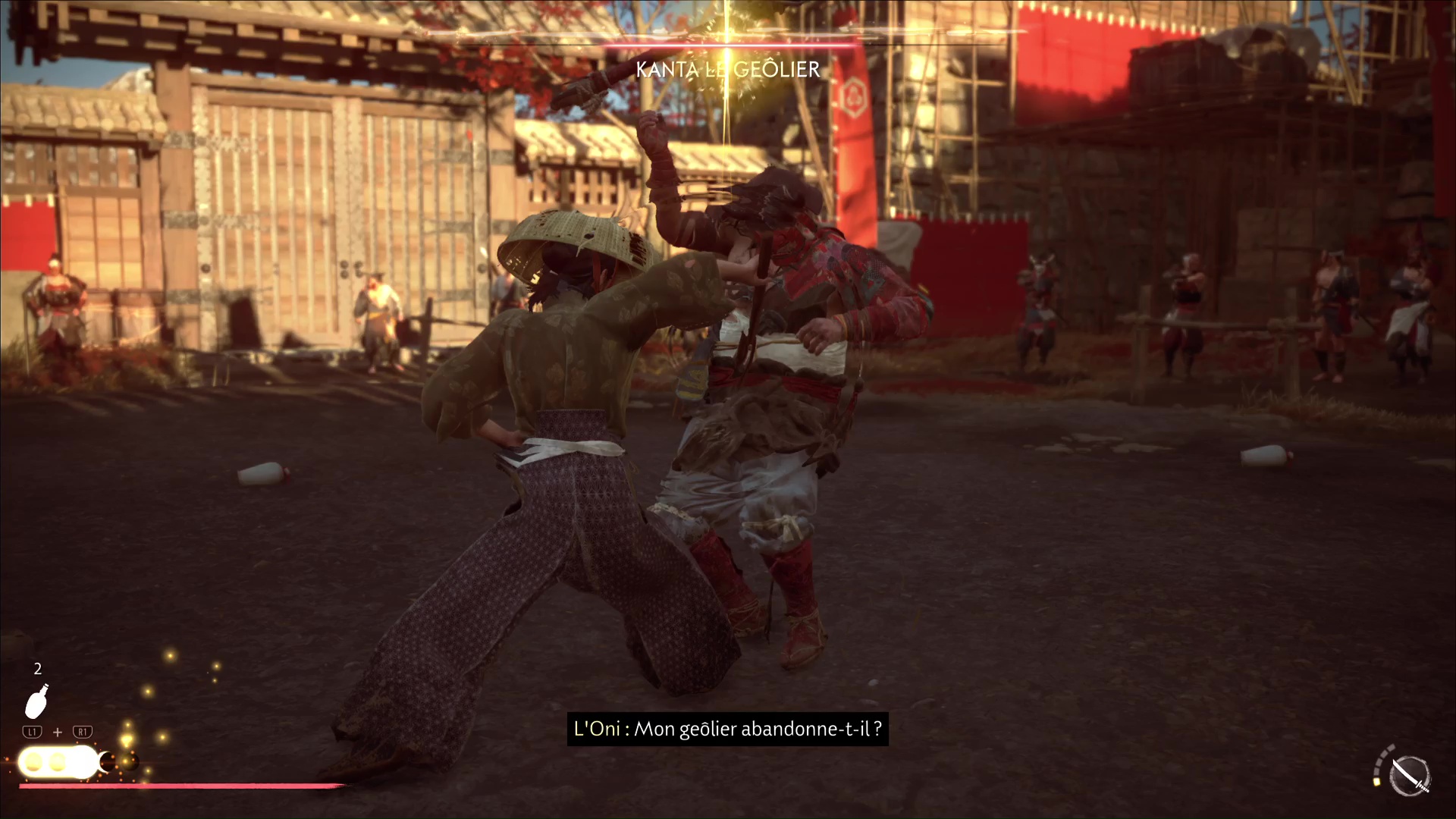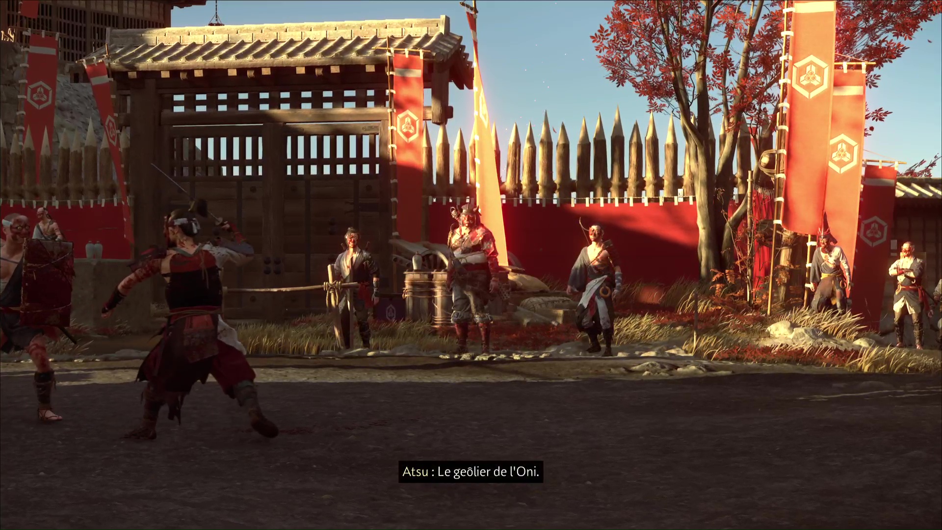 Suivez ensuite l’Oni et celui-ci annoncera la couleur sur ce qui attend Jubei. Arrivé dans la cour principale, vous croisez Kanta, un grand gaillard. Celui-ci semble porter les clés des cellules du château, ce qu’a bien remarqué Atsu.