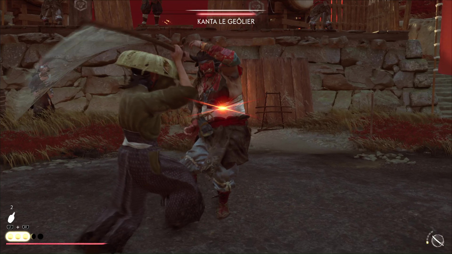 Vous pourrez d’ailleurs contrer un désarmement pour qu’il le lâche. Il poursuivra alors le combat à mains nues. N’oubliez pas non plus les jarres de saké vides à lancer sur votre ennemi pour le déséquilibrer brièvement.