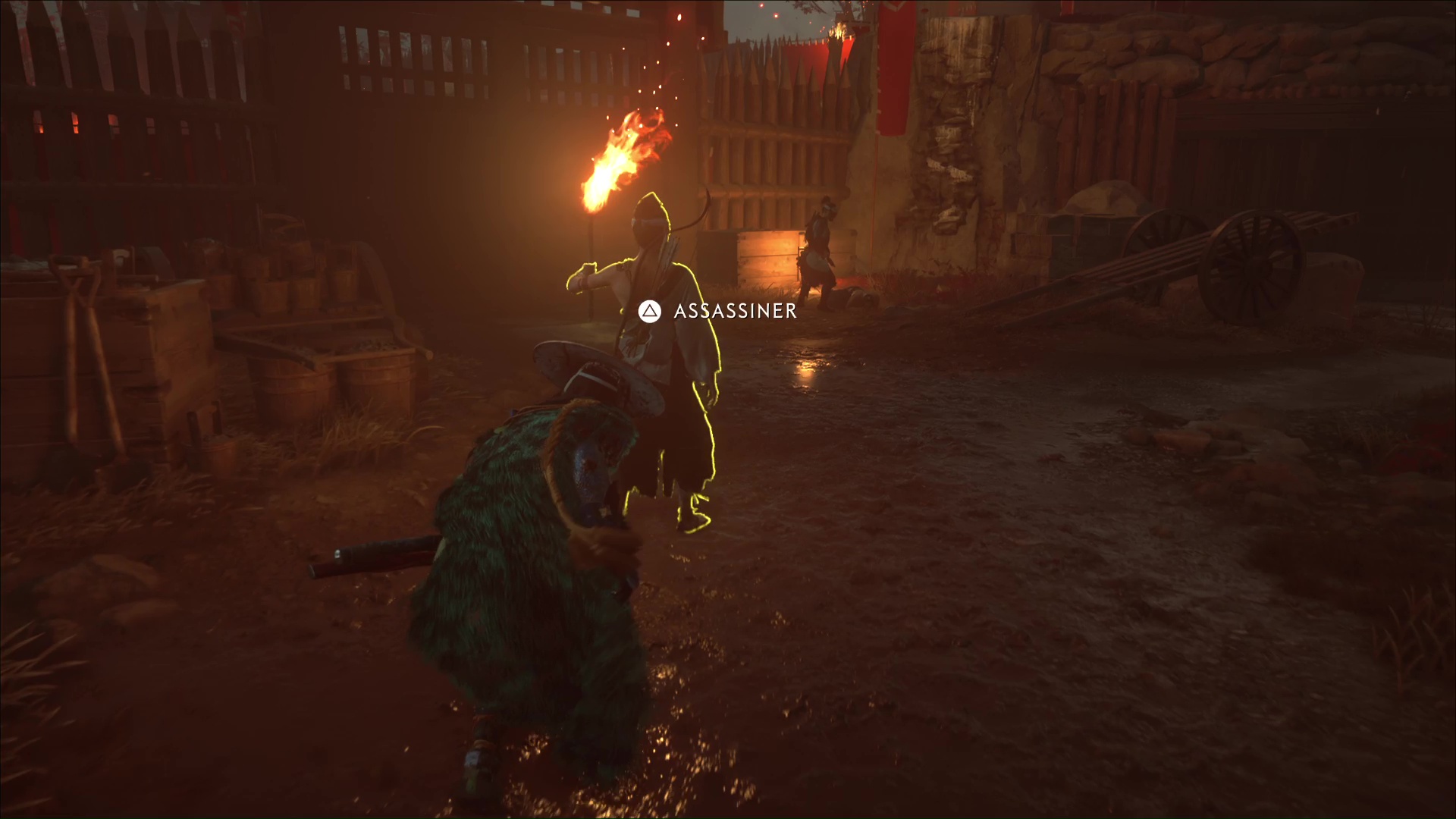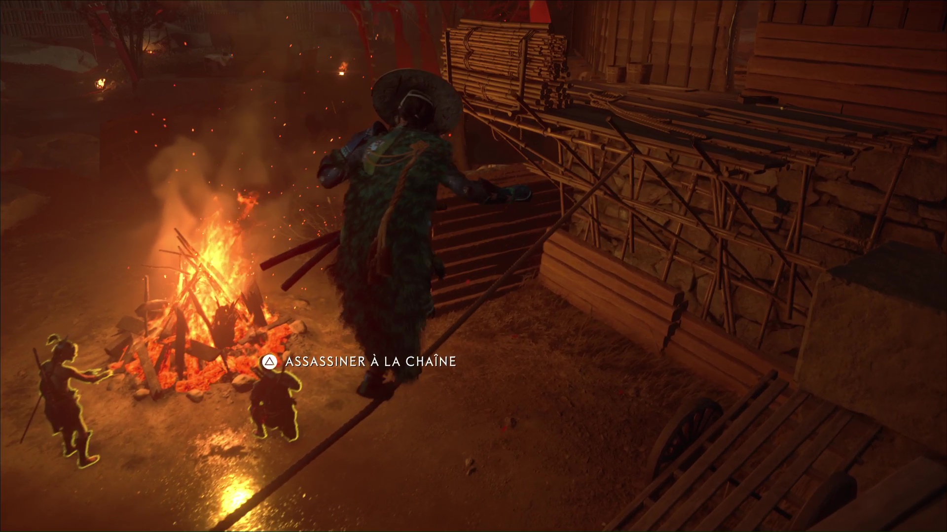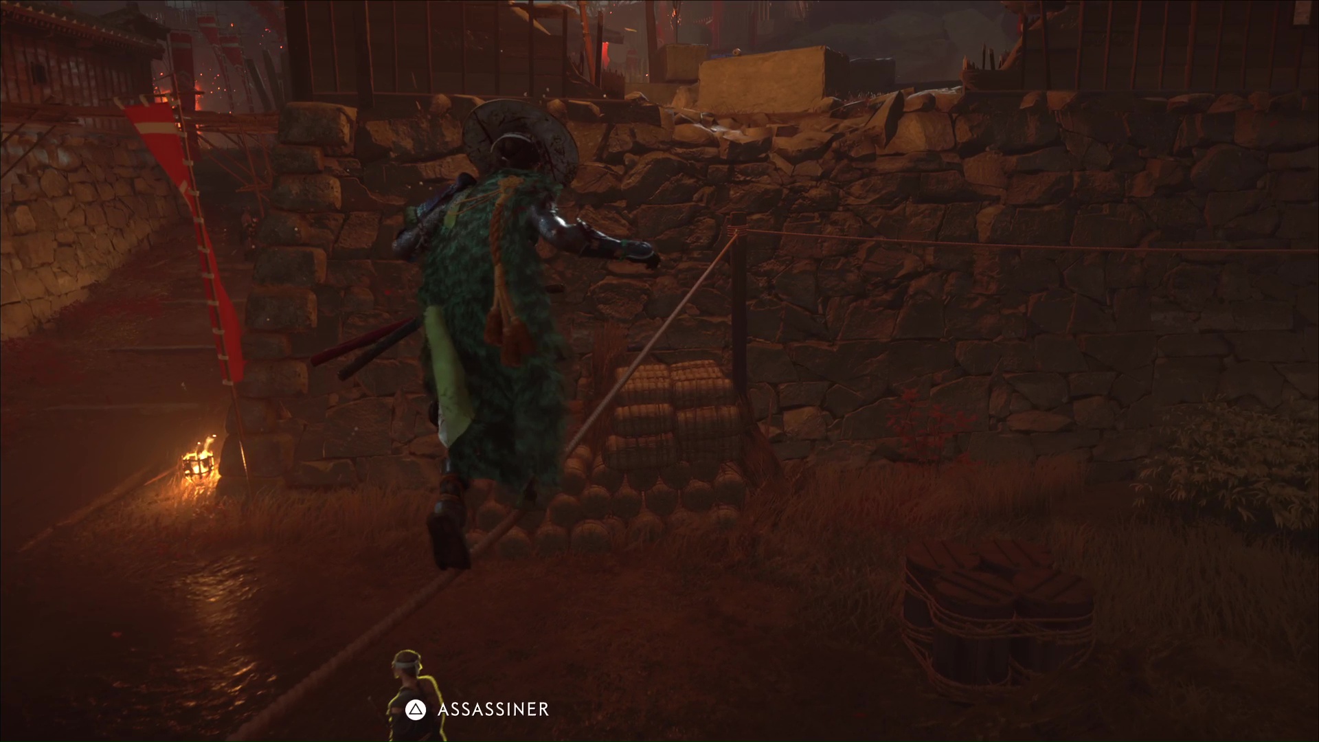 Dès que vous êtes prêt, préparez-vous à infiltrer le château pour aller sauver Jubei. La porte d’entrée est bien sûr gardée, donc partez sur la droite. Un ennemi est debout près d’un feu de camp. Assassinez-le pour être tranquille. Poursuivez sur la droite et remarquez la corde suspendue. C’est par là que vous allez passer.
