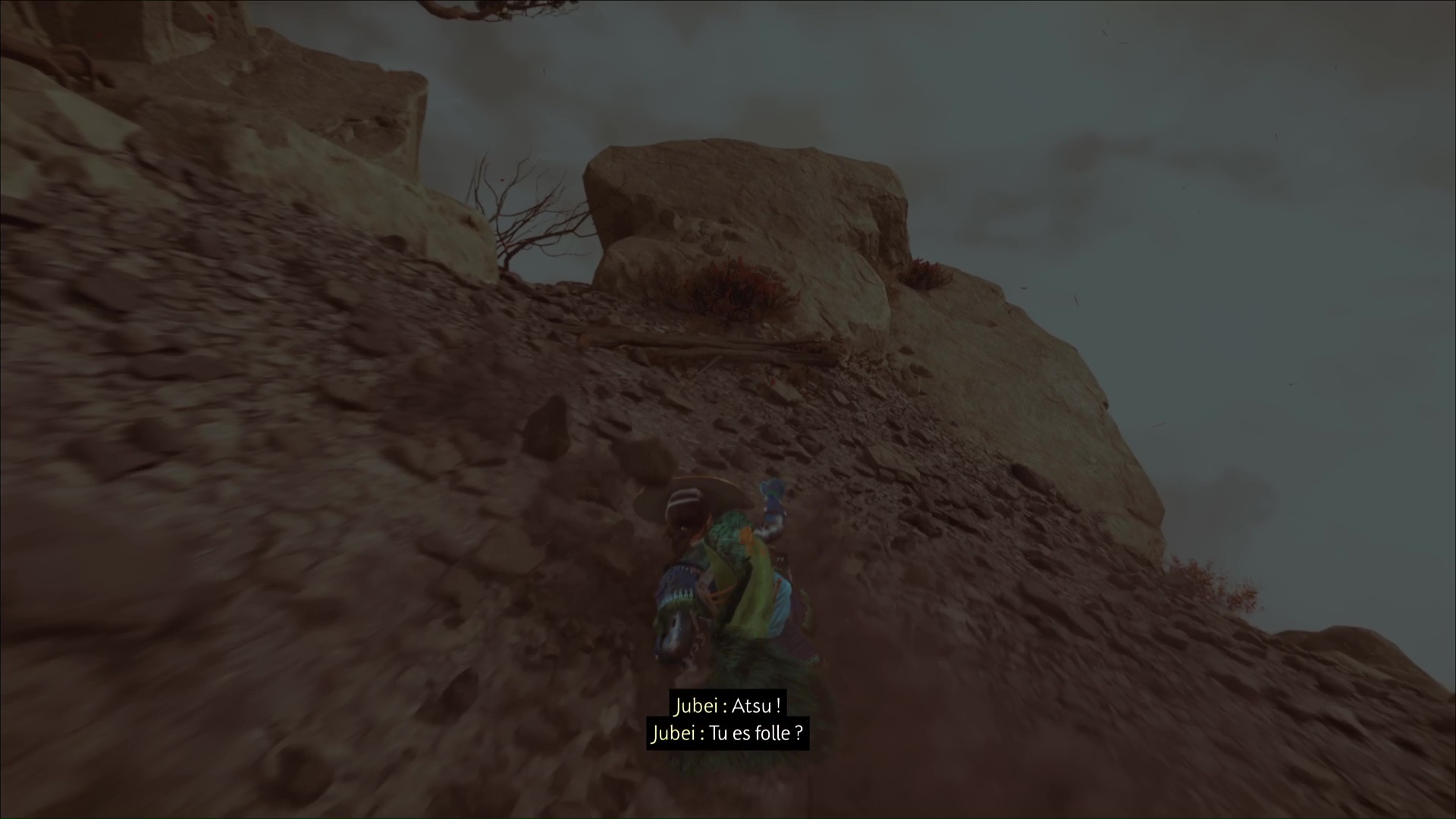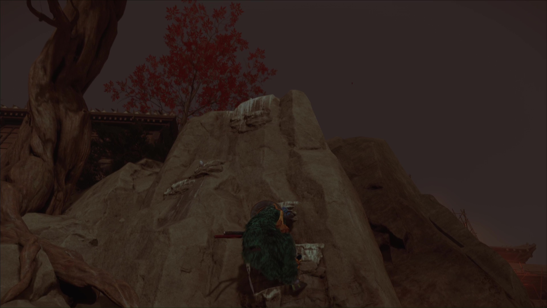 Au bout d’un moment, Atsu mentionnera le fait de voir la lumière du donjon. Jubei estimera quant à lui que vous êtes dans une impasse. Prouvez-lui qu’il a tort en sautant sur la pente glissante en face de vous, ce qui vous mènera au bord de la falaise, sur un rocher stable.