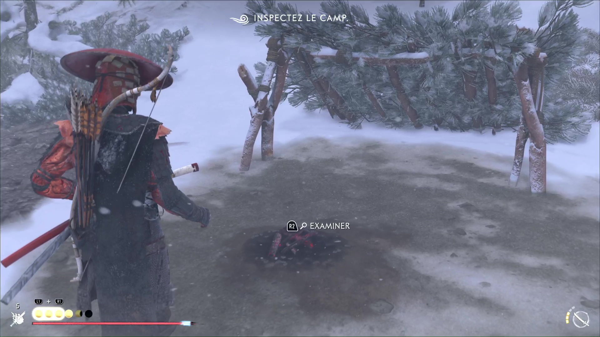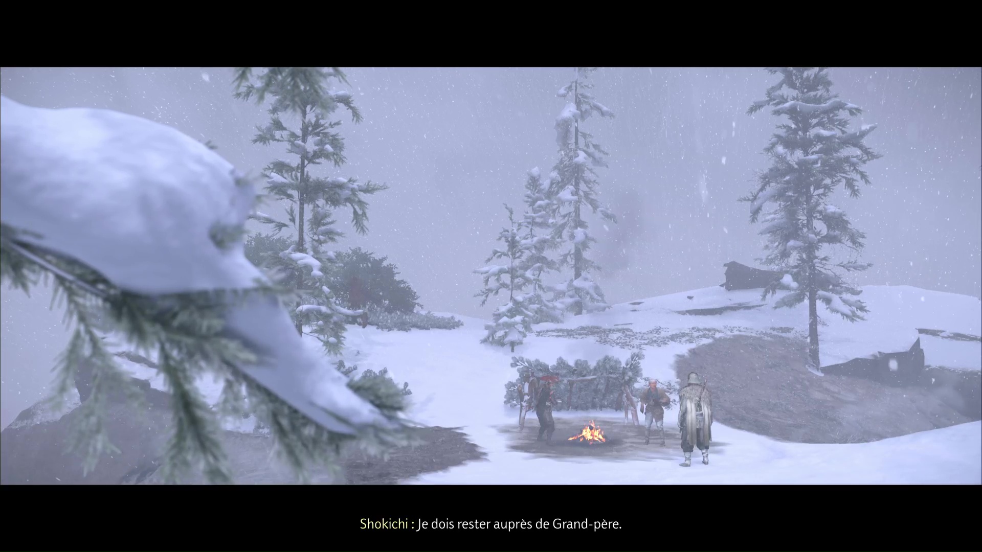 Une fois la paroi gravie, cherchez un moyen d’atteindre l’autre montagne en sautant vers un tronc à grappin. En face, vous tombez rapidement sur un campement. Allez examiner le feu éteint puis rallumez-le pour tenter d’attirer Shokichi.