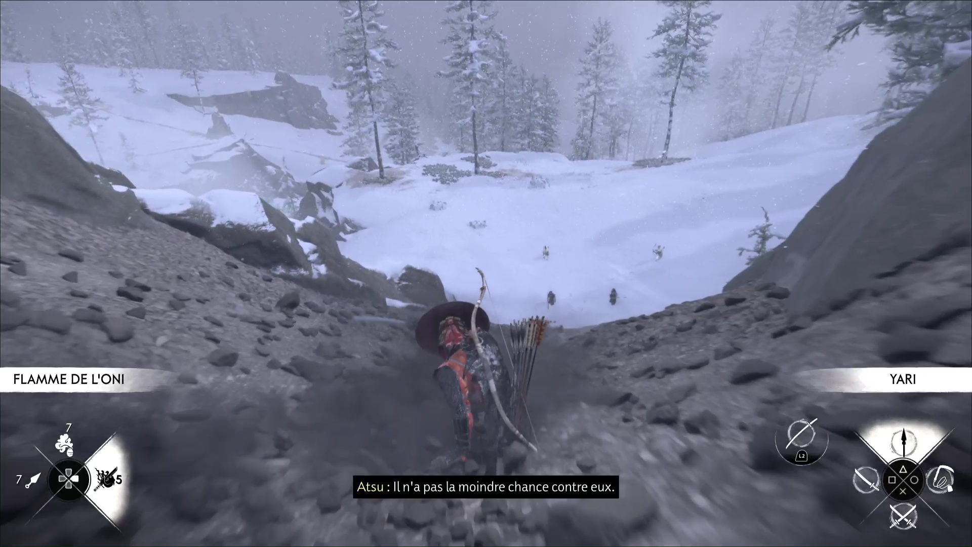 Ça fonctionne, celui-ci vient à votre encontre. Vous apprenez qu’il a tenté d’approcher les Neuf-Queues pour s’occuper de son grand-père. Atsu tente de le raisonner en lui disant que ce n’est pas la bonne voie à suivre.
