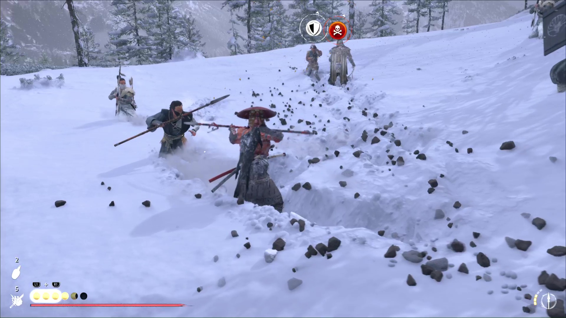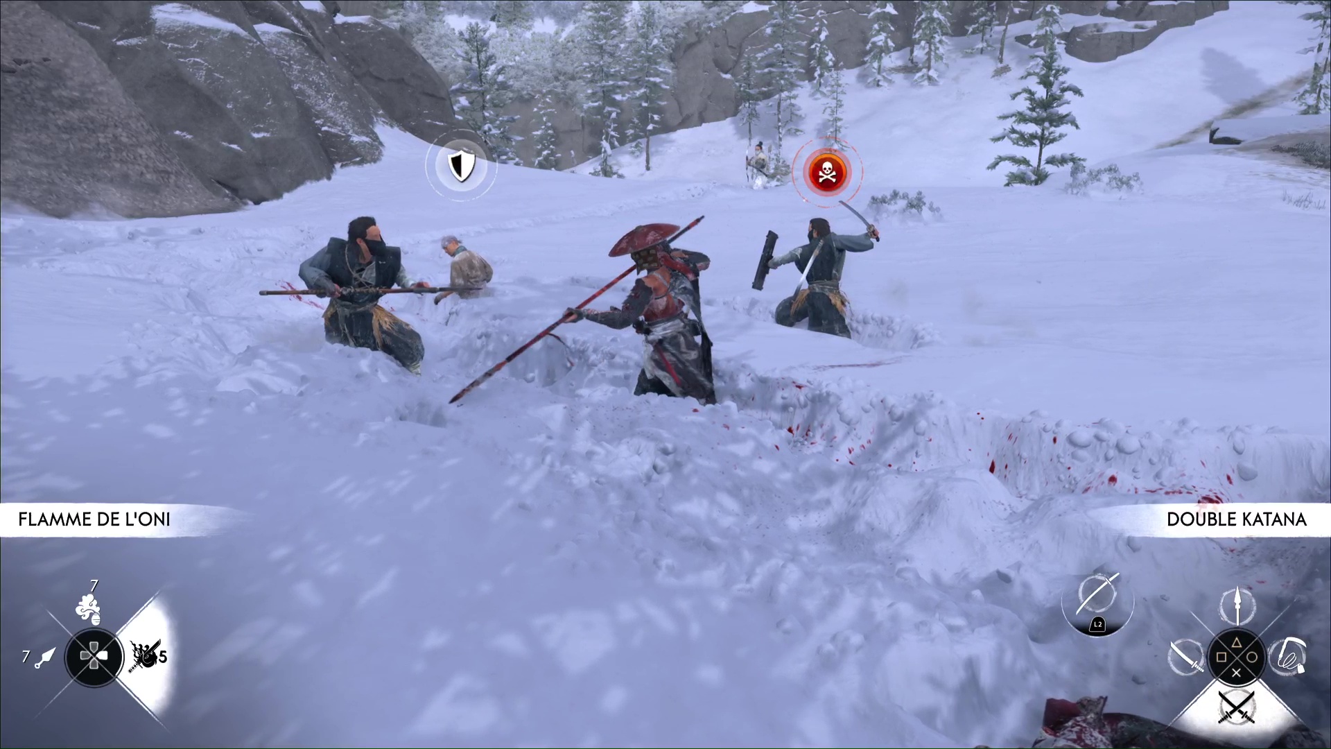Il est très important de garder un œil sur Shokichi car il sera pris pour cible par les Neuf-Queues. Allez donc toujours frapper celui qui s’apprête à l’attaquer, symbolisé par une tête de mort. Combattez en faisant en sorte d’utiliser votre arme forte selon celle de l’ennemi en face, puis, une fois tous les Neuf-Ques tués, un dialogue se déclenche automatiquement avec Shikochi.