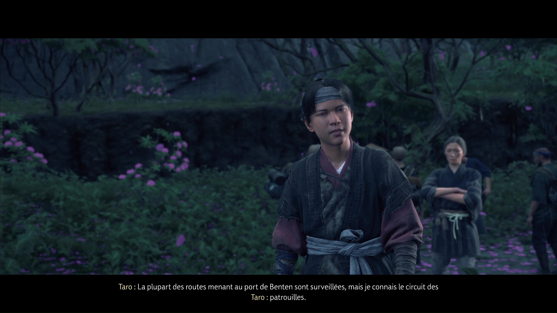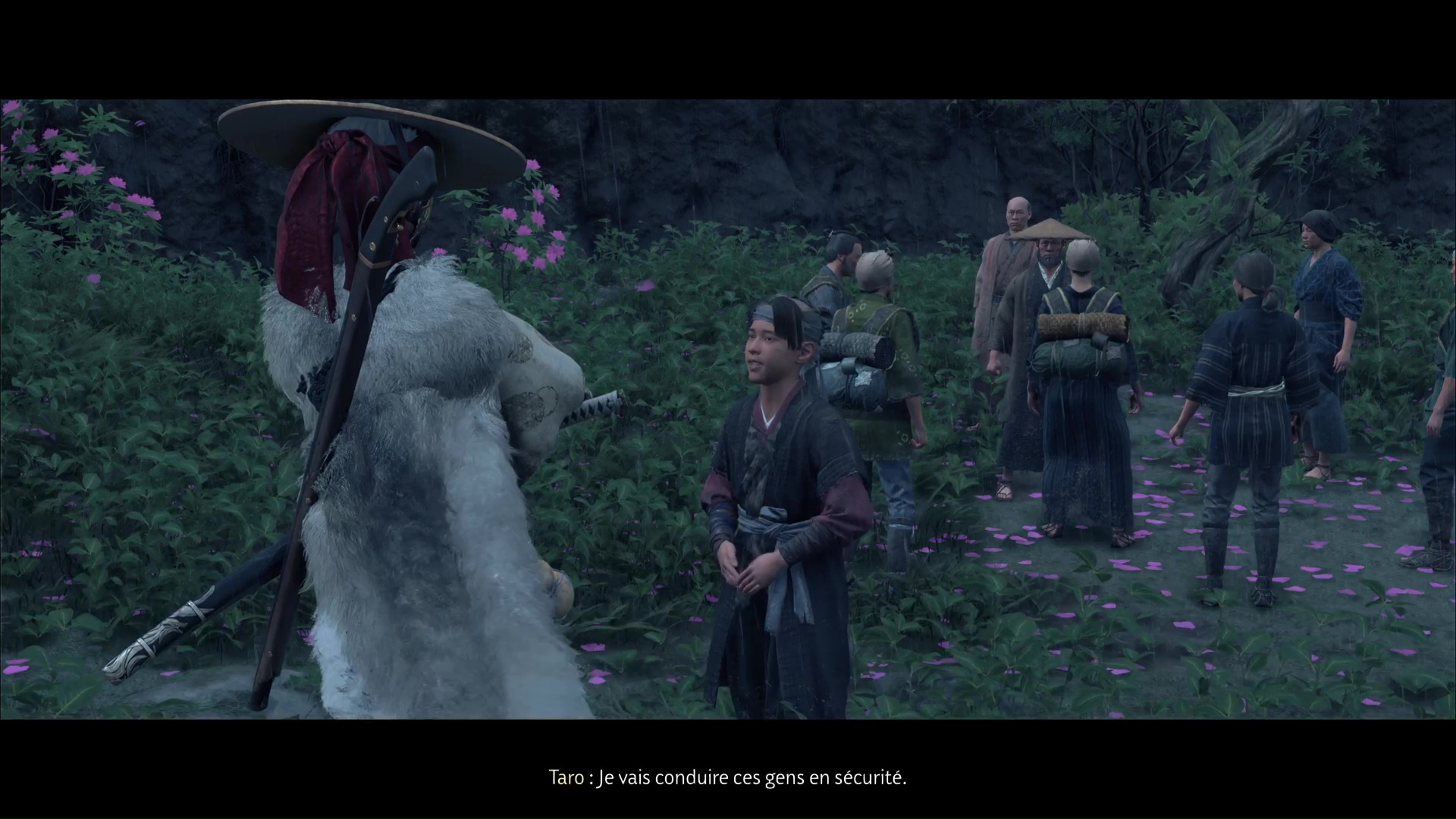 Acceptez de démarrer la quête quand c’est bon pour vous, puis suivez Taro en compagnie du groupe de réfugiés. Sur le trajet, vous aurez une discussion avec Taro avant d’entendre retentir un coup de feu.