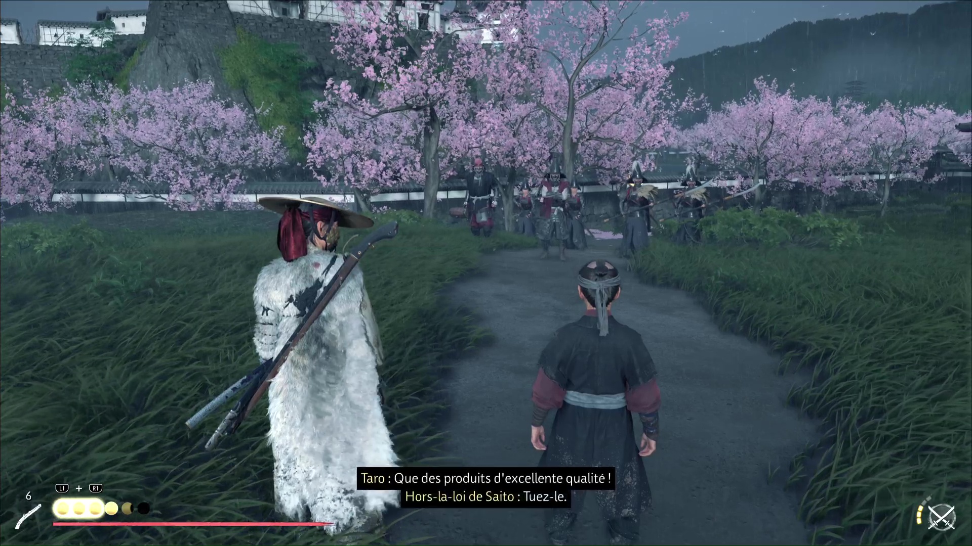 Courez ensuite pour rejoindre Taro, lequel tente de négocier avec les hors-la-loi. Évidemment, ça ne marche pas et vous voilà embarqué dans un nouveau combat. Parmi ces nouveaux ennemis, notamment deux tireurs, une brute, et un porteur d’éventail. Tuez d’abord ce dernier et terminez l’affrontement plus sereinement.